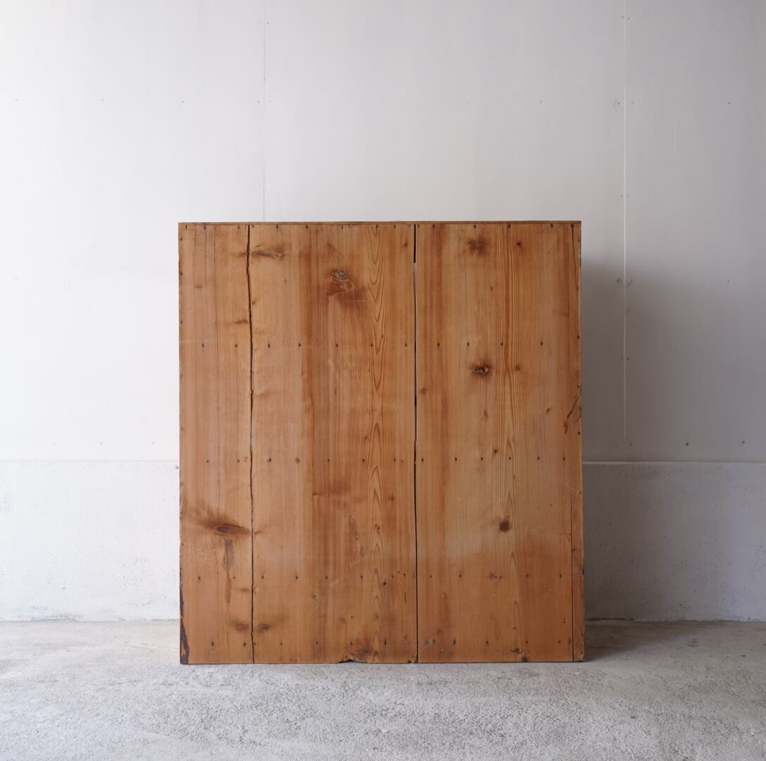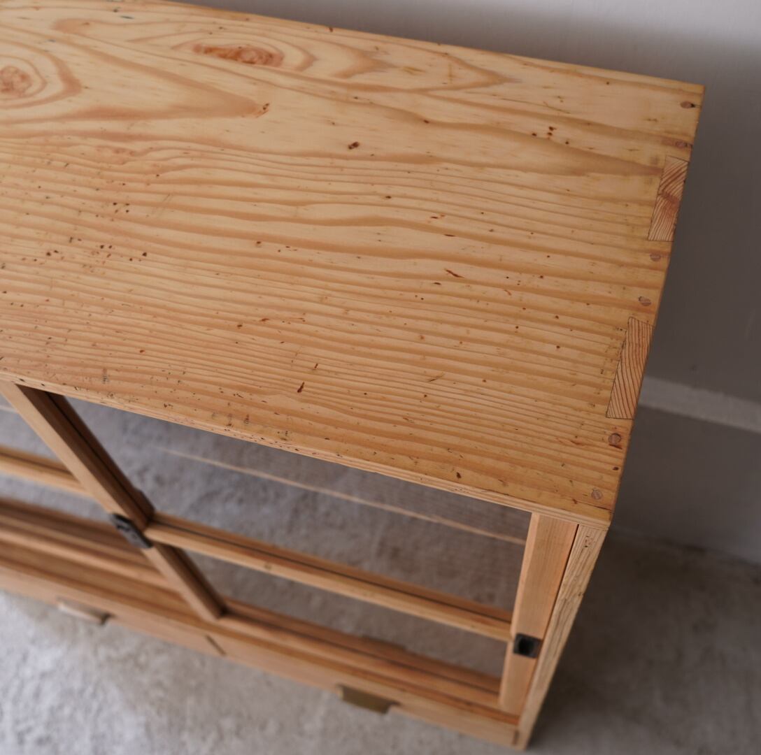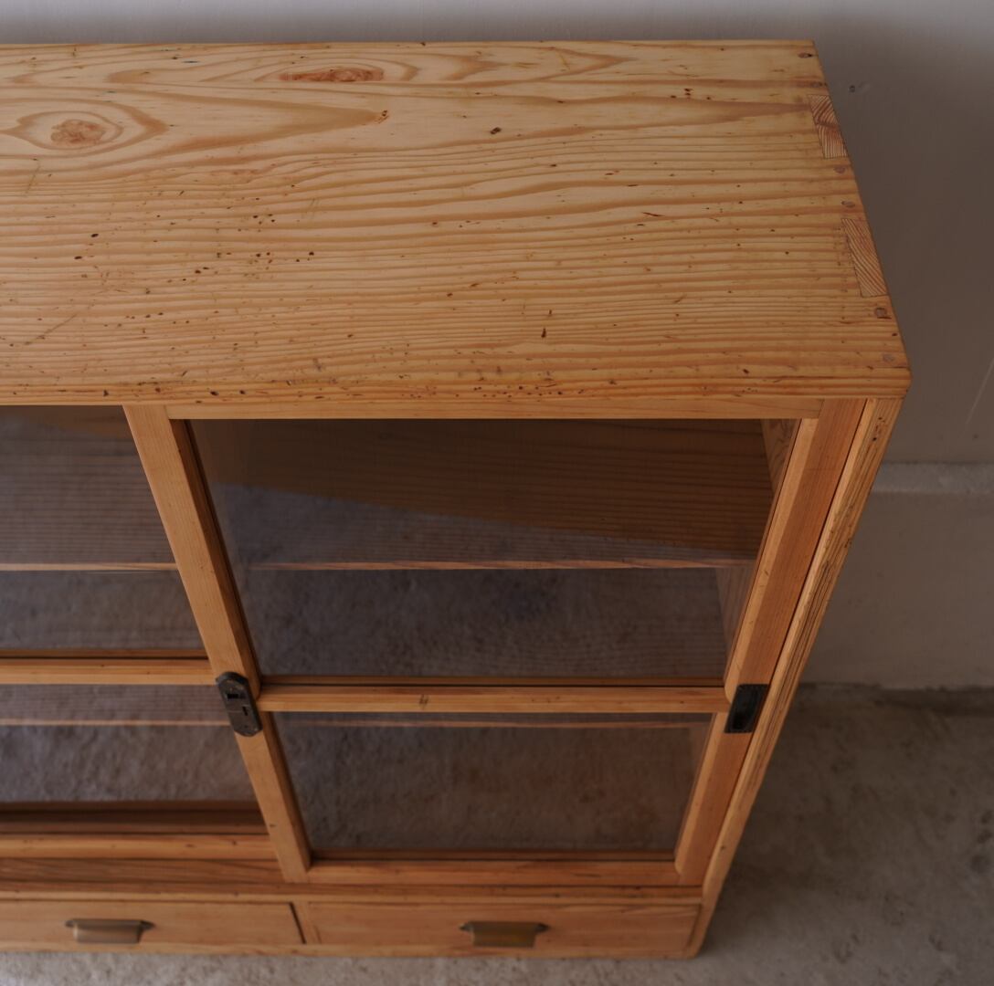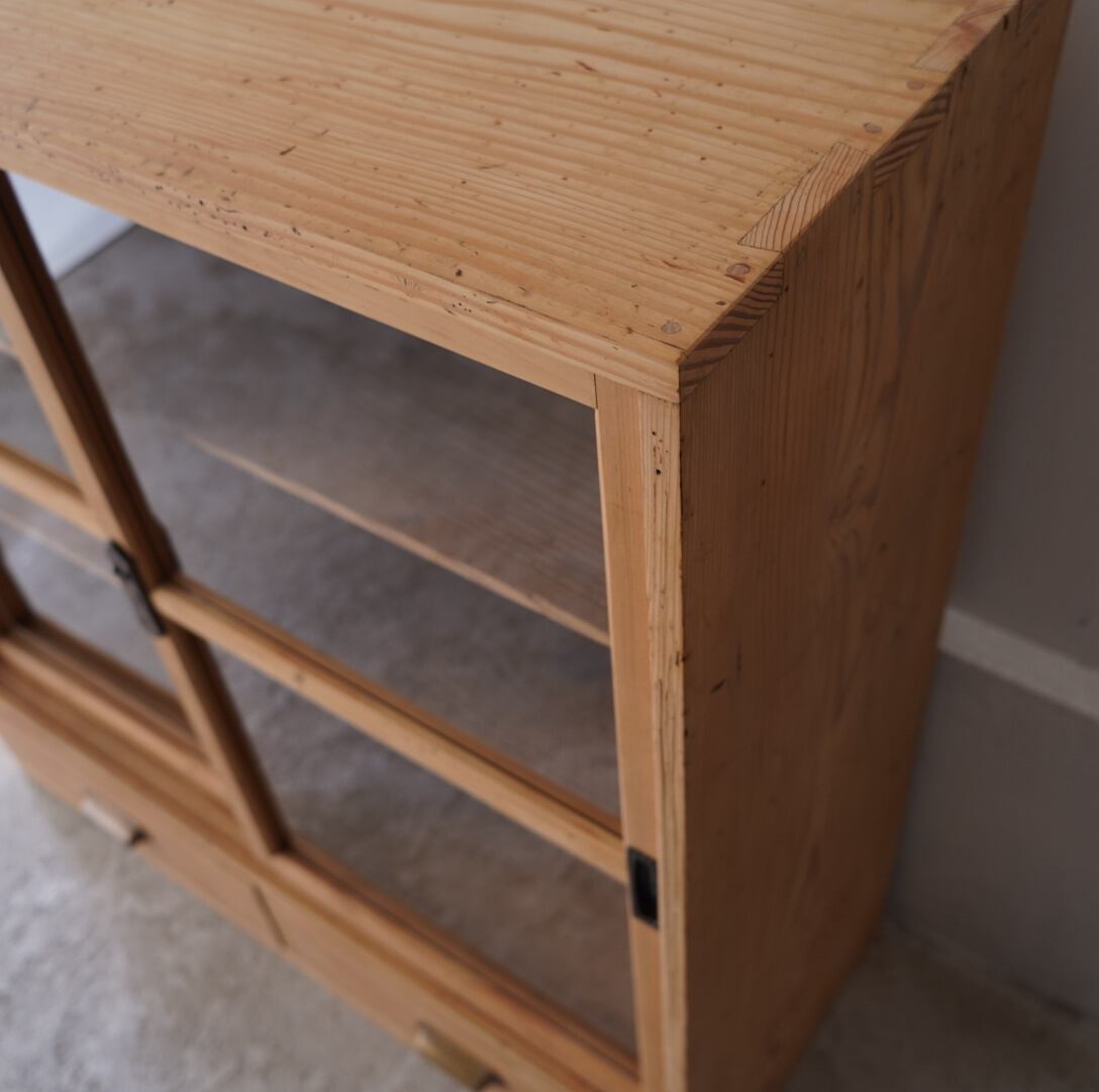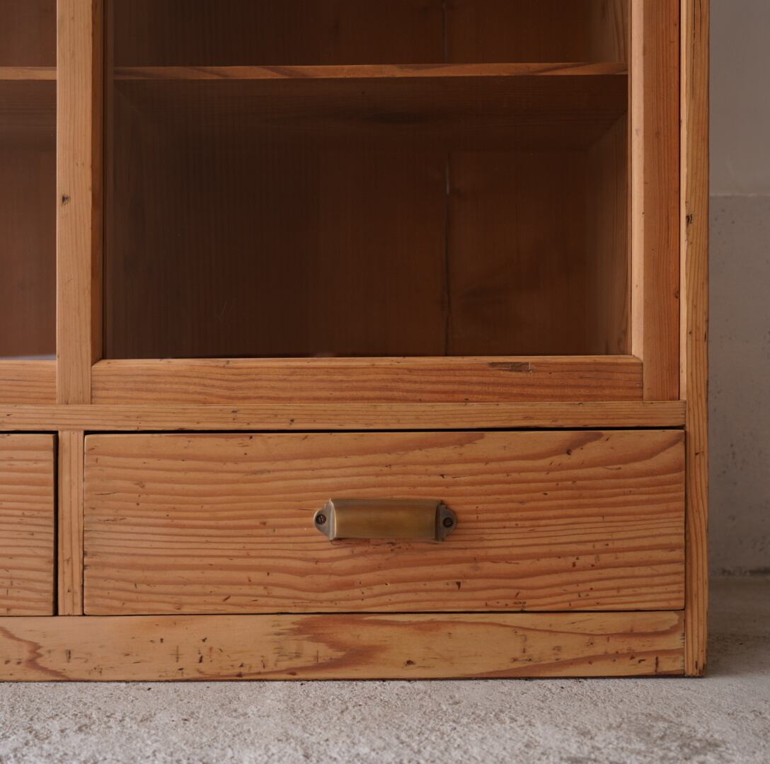 古い無垢材の素朴な風合いと大きな格子ガラスの引き戸が美しいキャビネット。