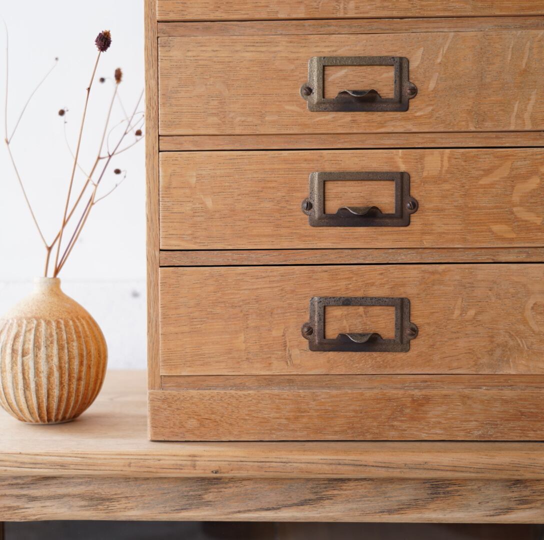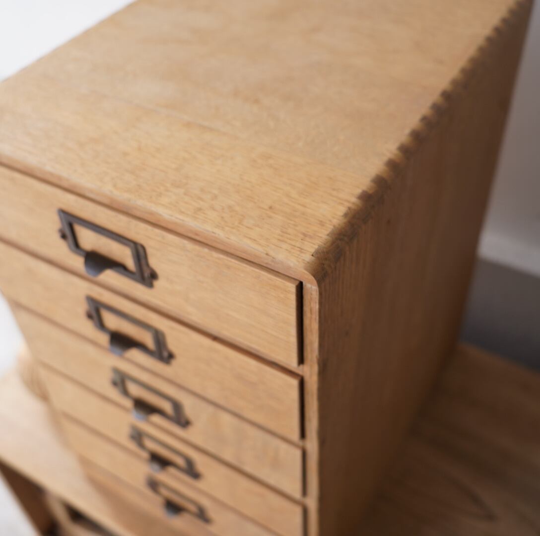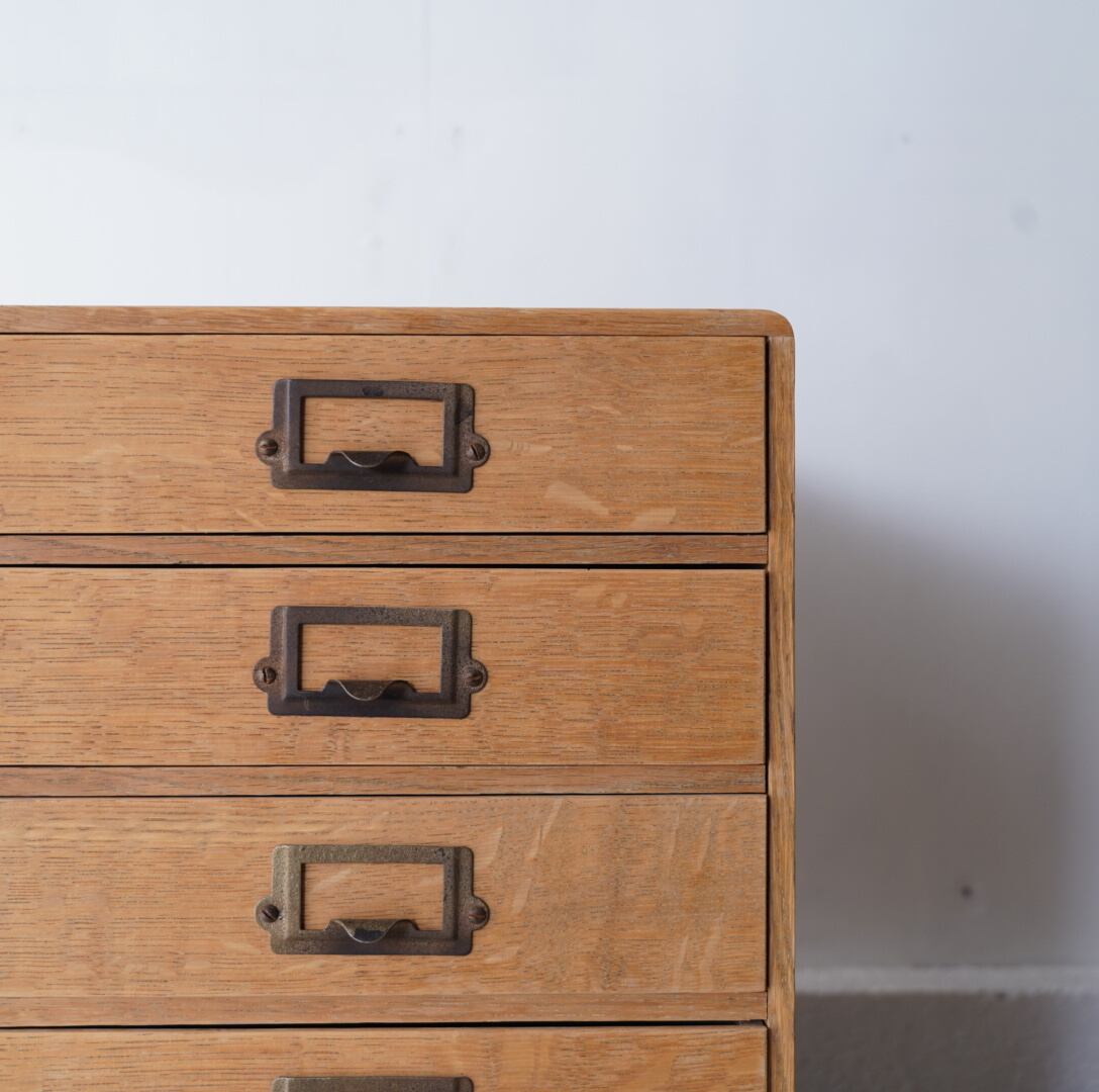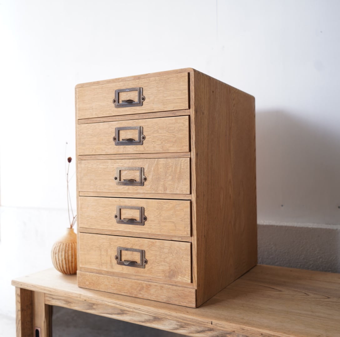 楢材の温かみのある木味と経年変化のあるネームプレートが可愛らしい5杯の引き出しです。