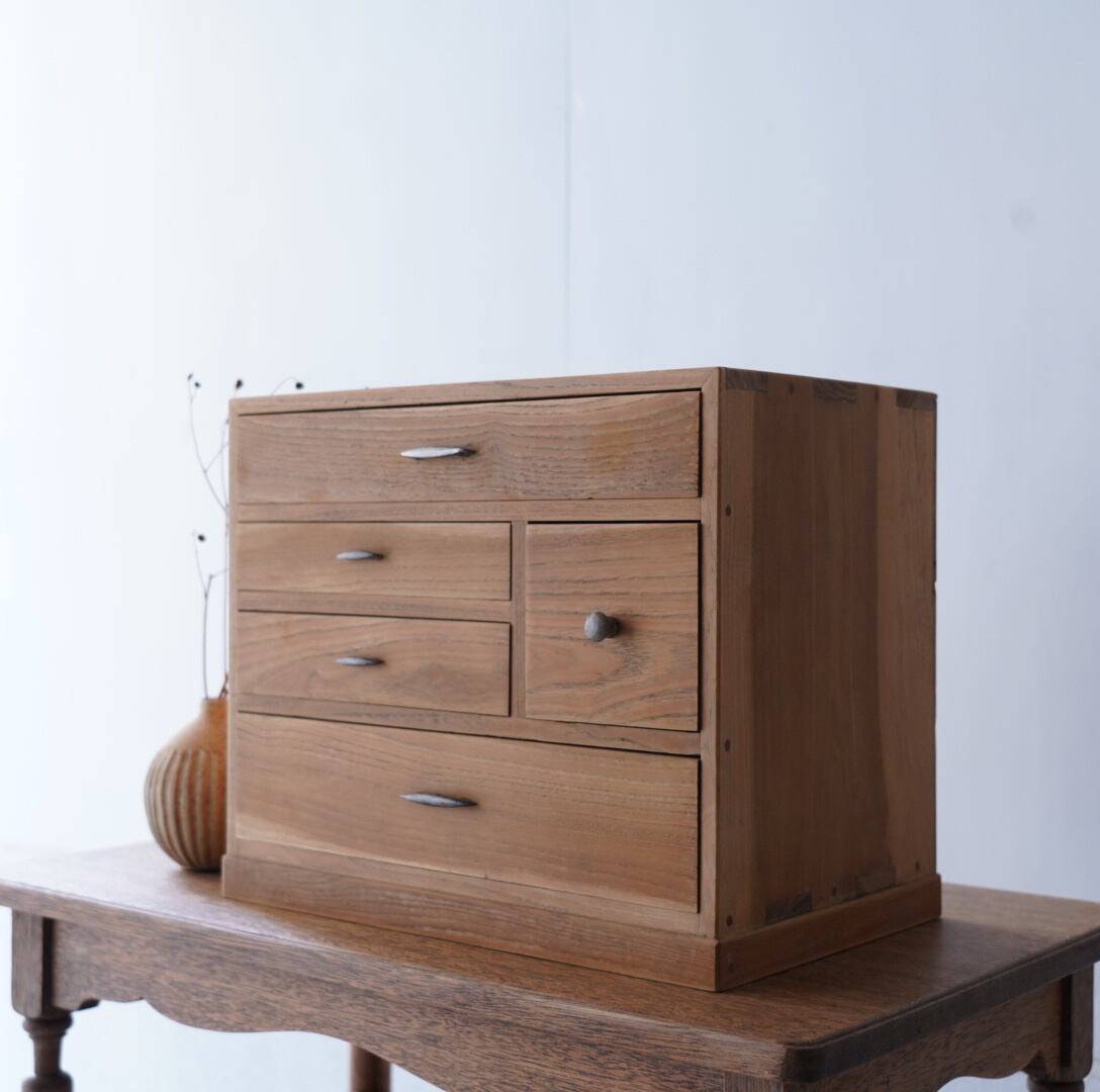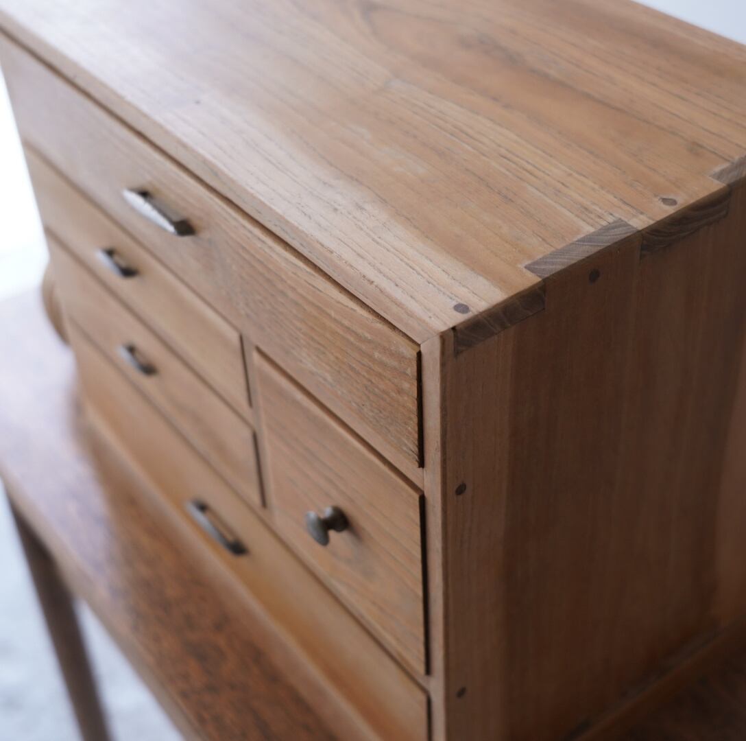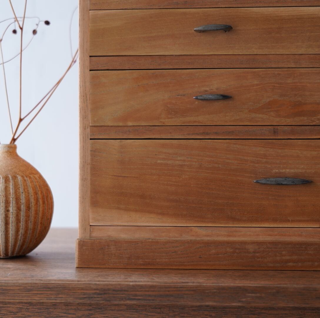 無垢材のナチュラルな木味とひかえめな金属取手が可愛らしい5杯の引き出し。