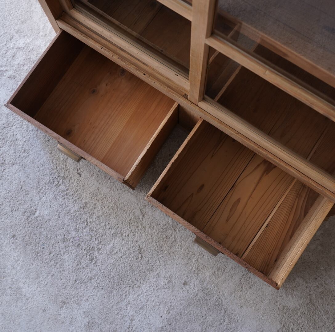 無垢材のナチュラルな木味と真鍮取手の引き出しが美しいキャビネット。