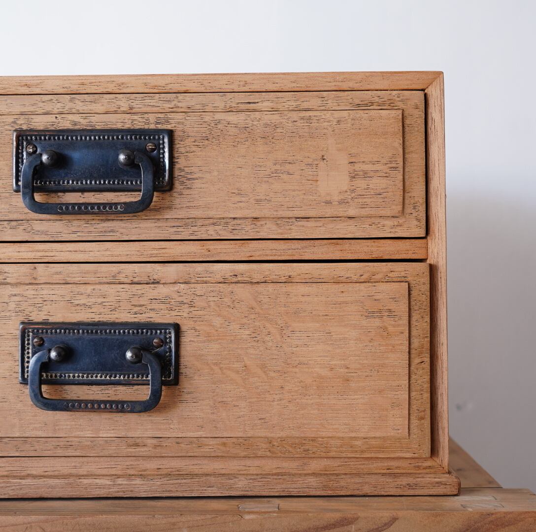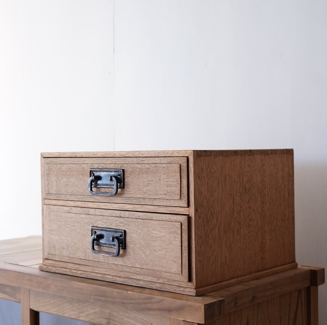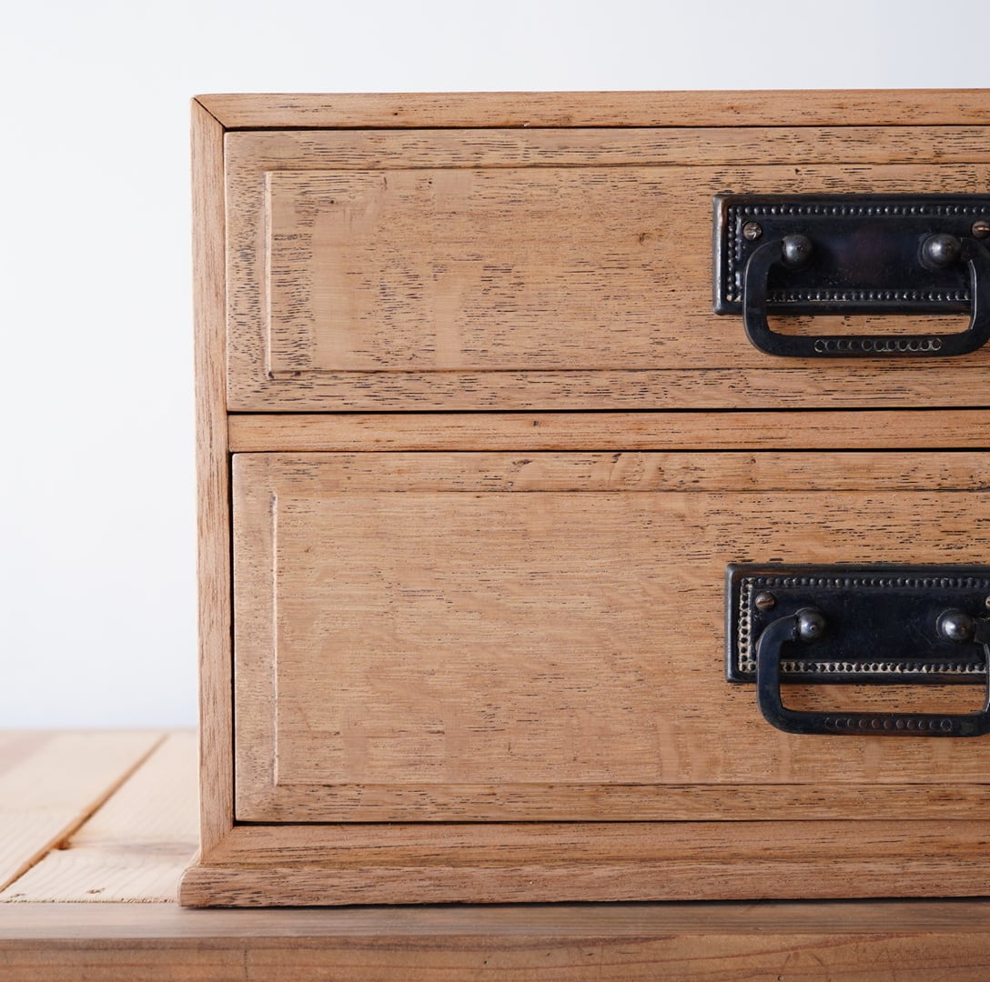 無垢材のナチュラルな木味と黒い金属の取手が美しい2杯の引き出し。