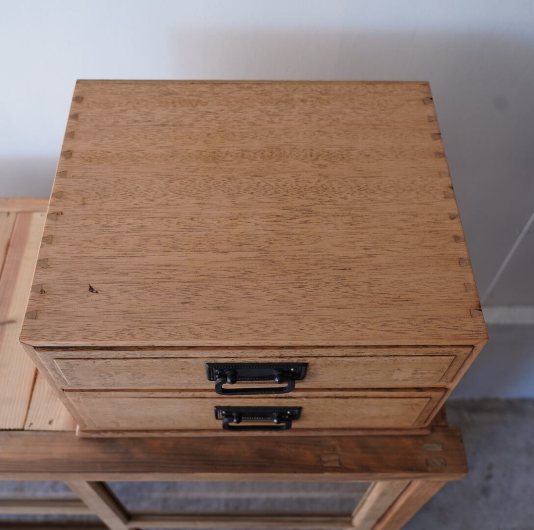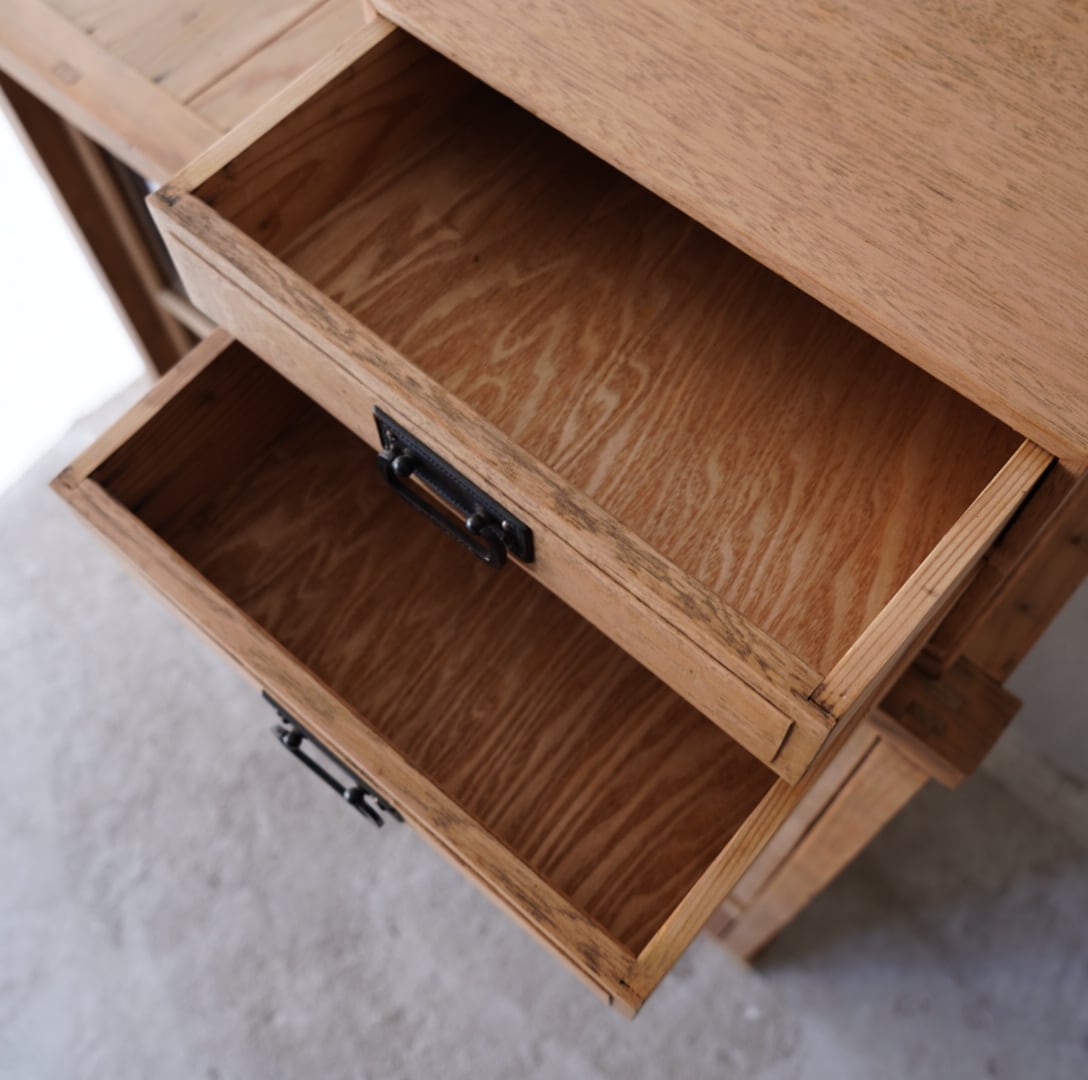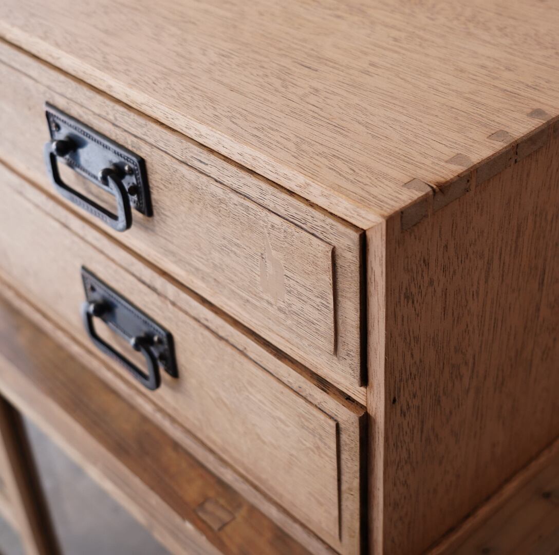 無垢材のナチュラルな木味と黒い金属の取手が美しい2杯の引き出し。
