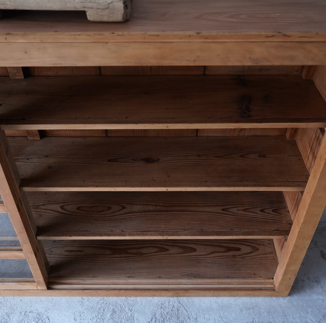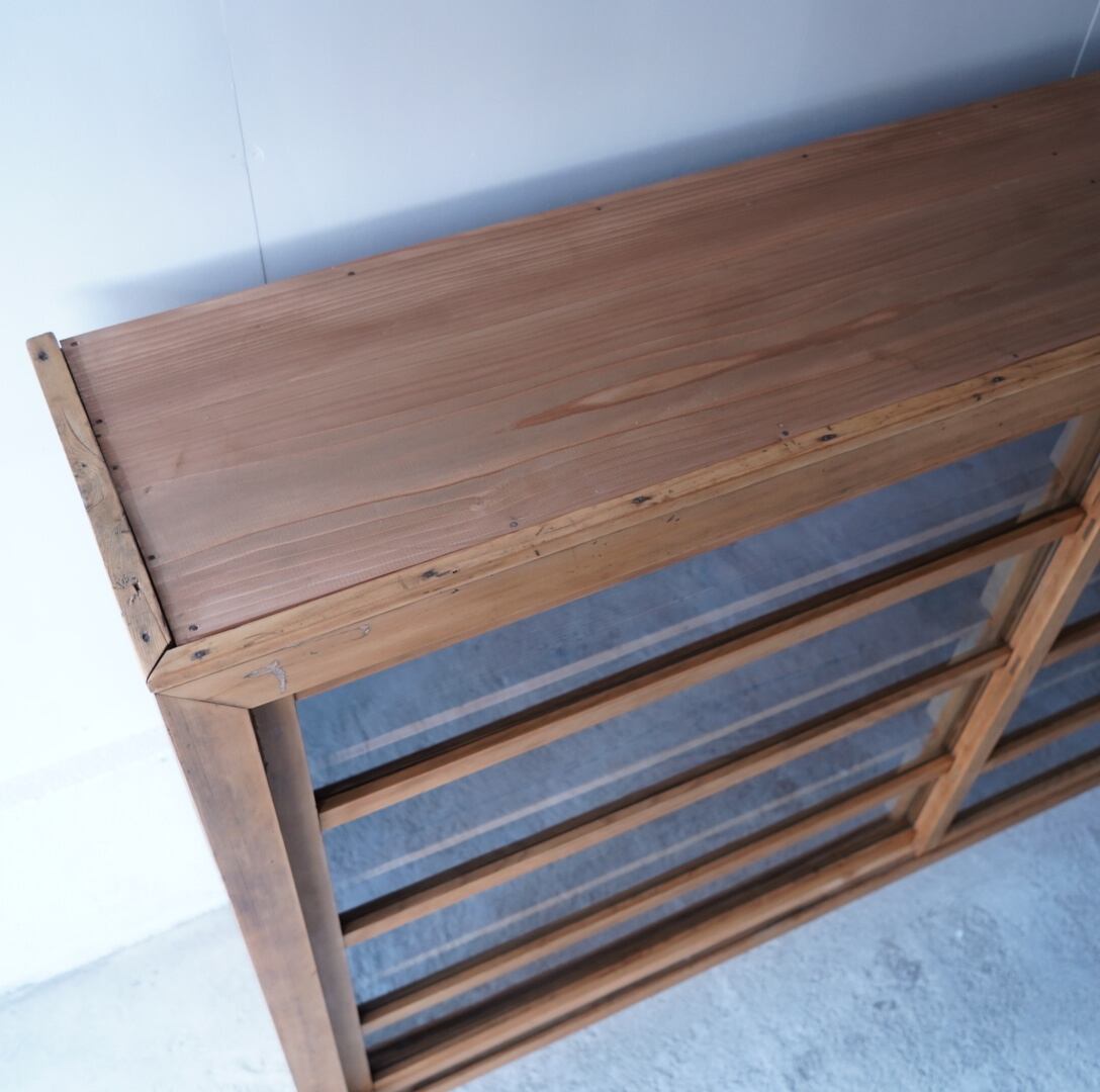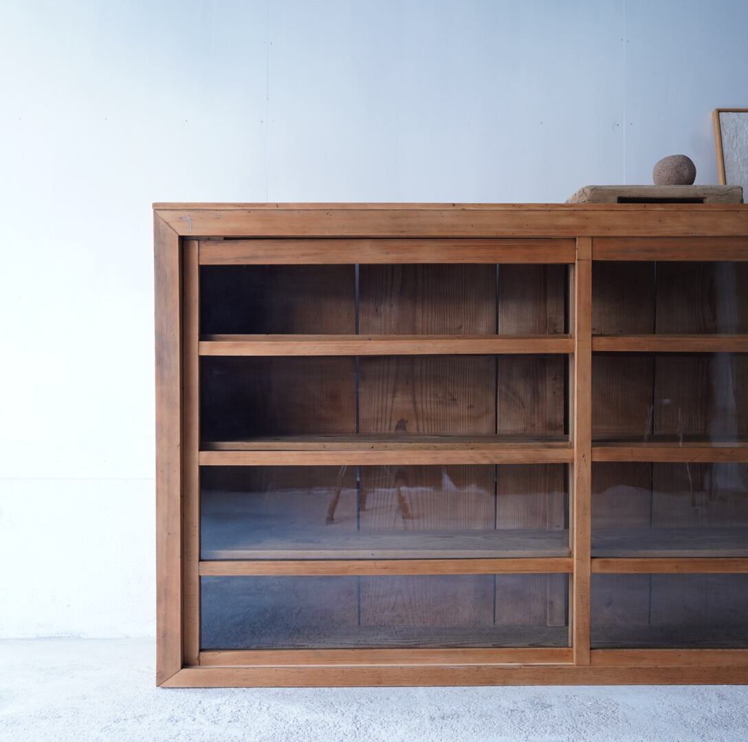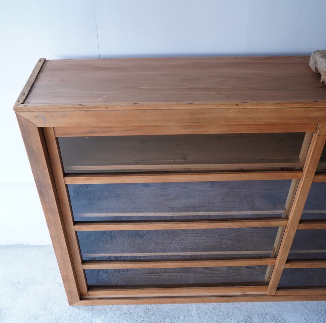 無垢材の温かみのある木味と大きな格子ガラスの引き戸が美しいキャビネット。
