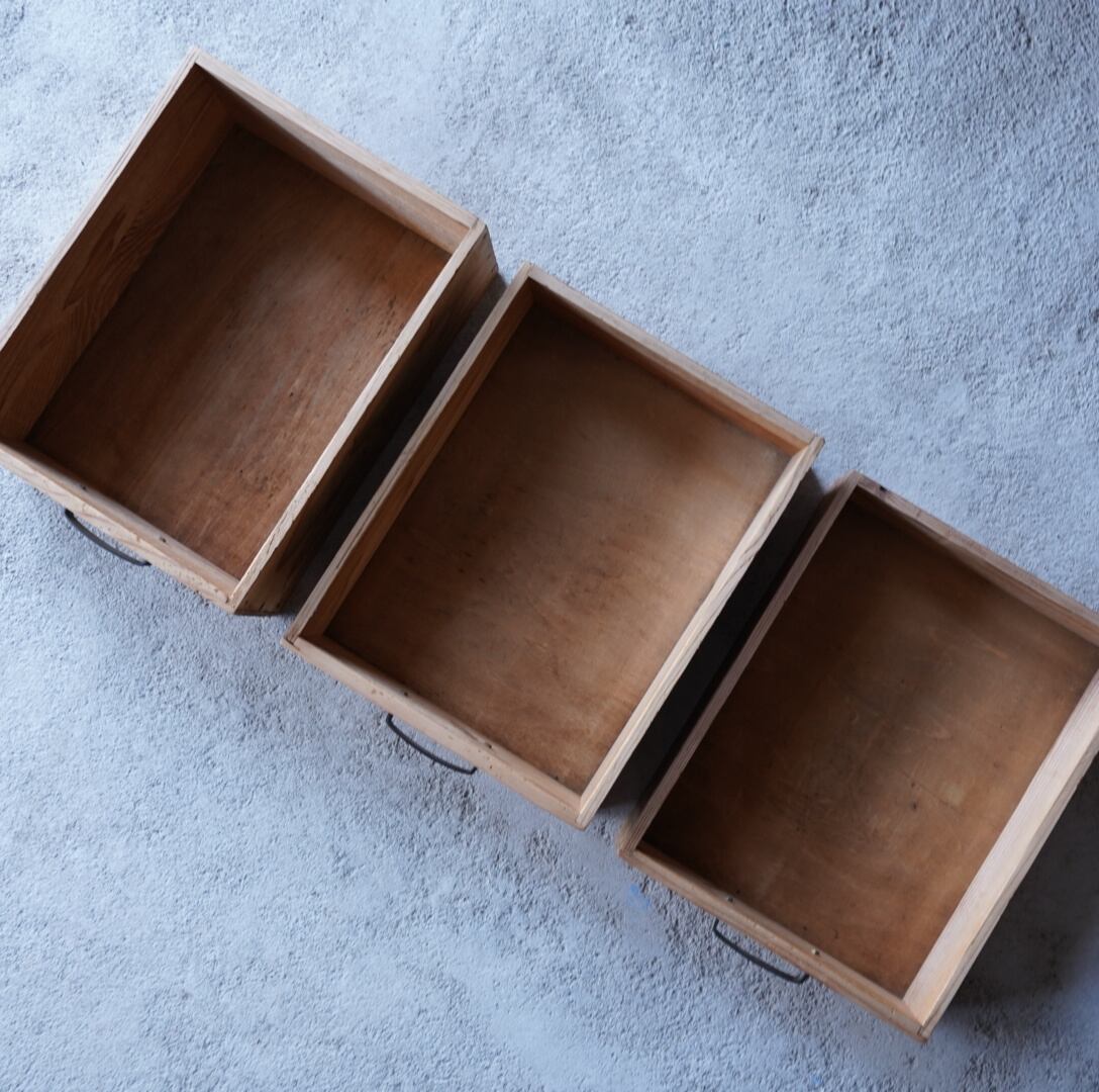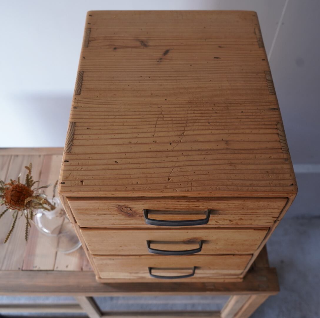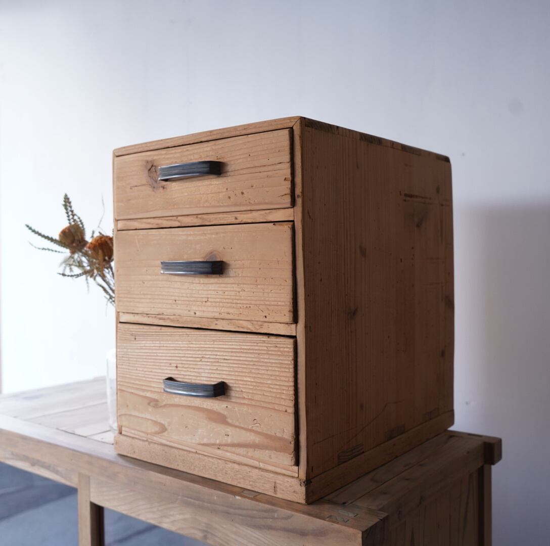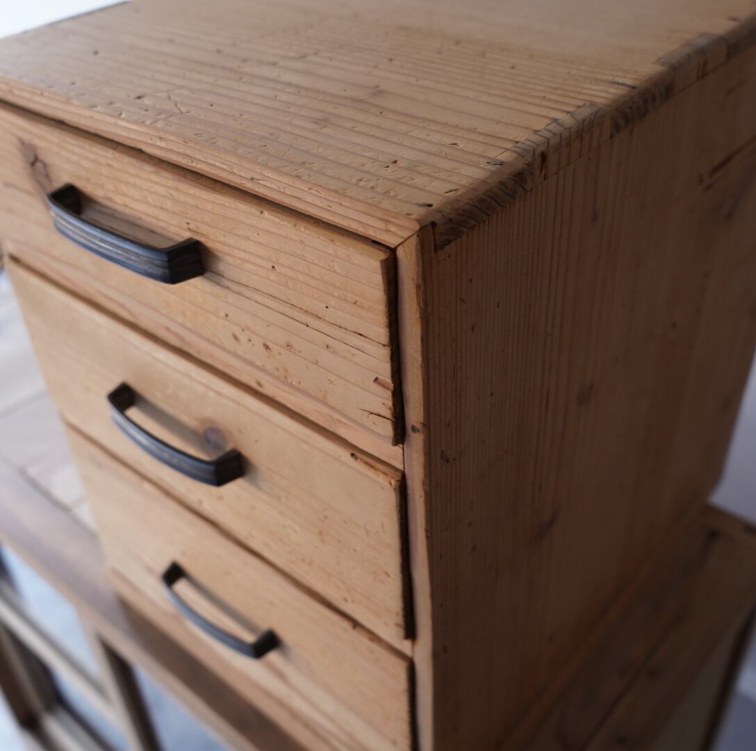 無垢材の素朴な風合いと古いアルミの取手が可愛らしい3杯の引き出し。