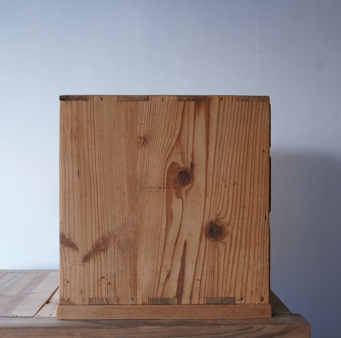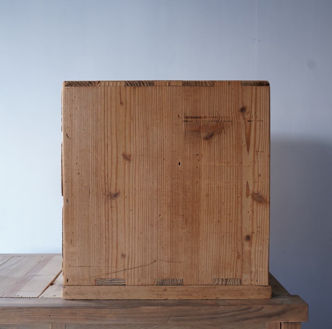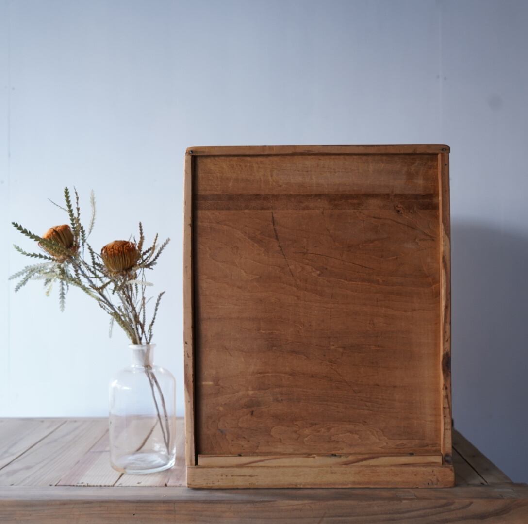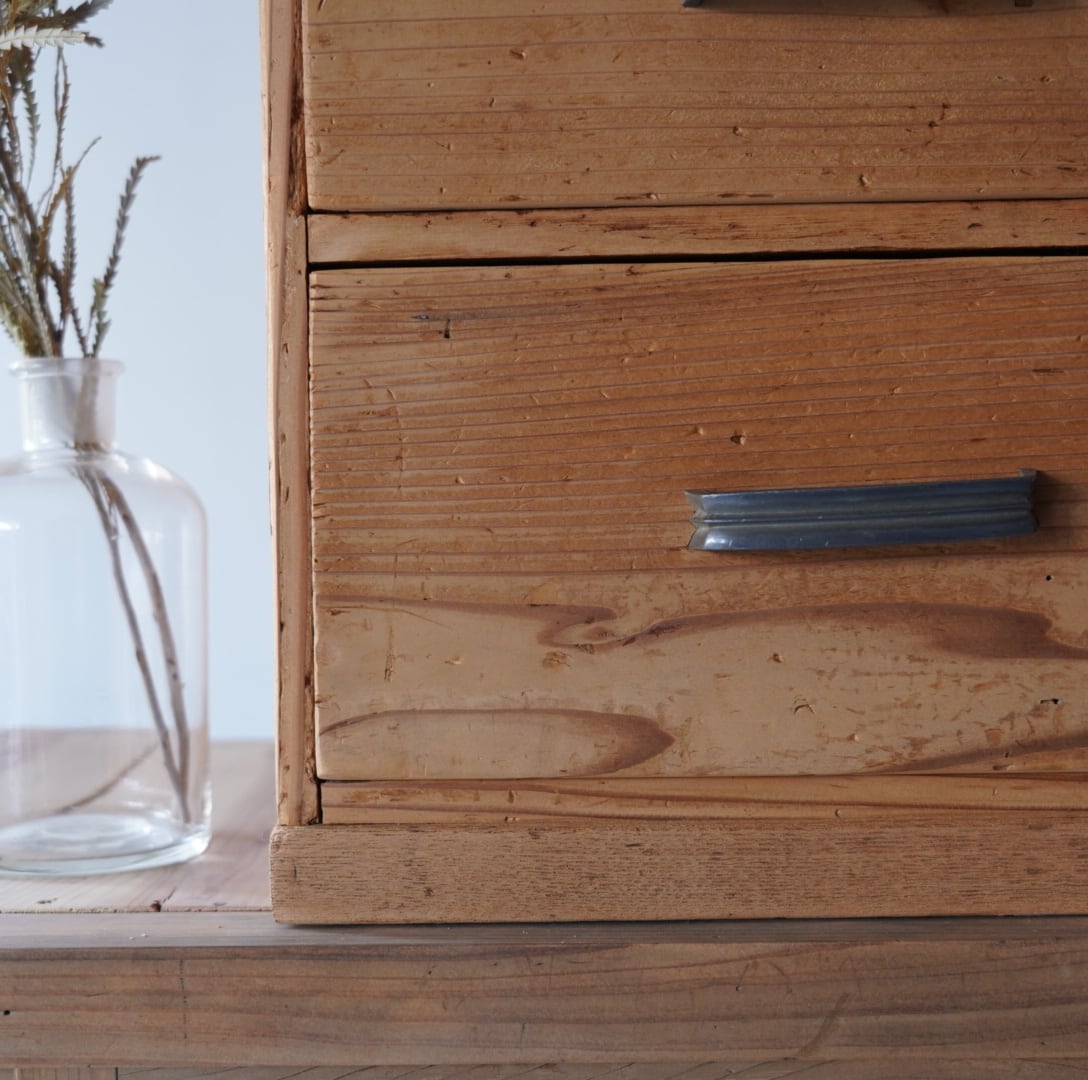 無垢材の素朴な風合いと古いアルミの取手が可愛らしい3杯の引き出し。