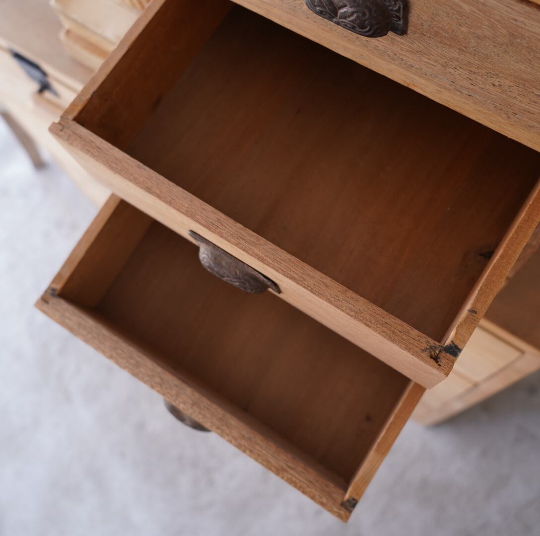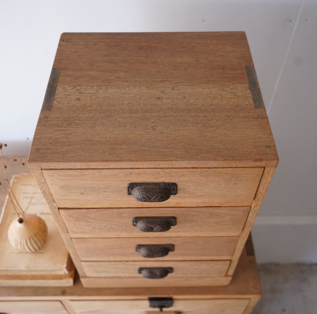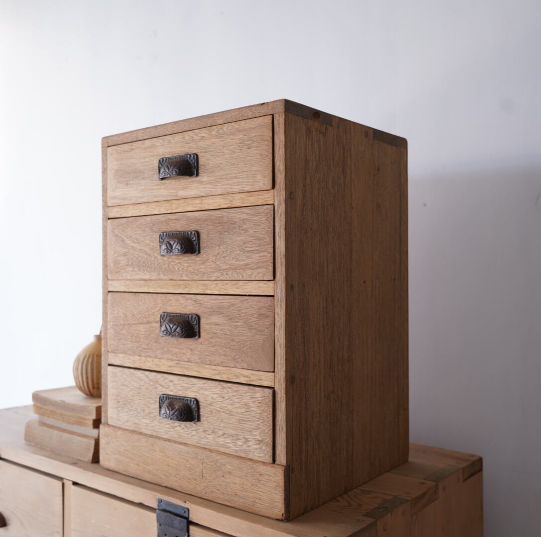温かみのある木味と黒い金属の装飾取手が魅力的な4杯の引き出し。
