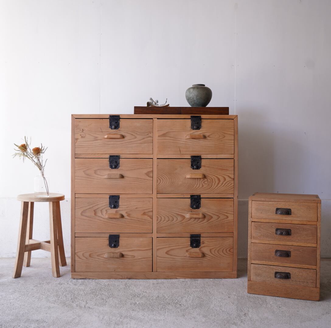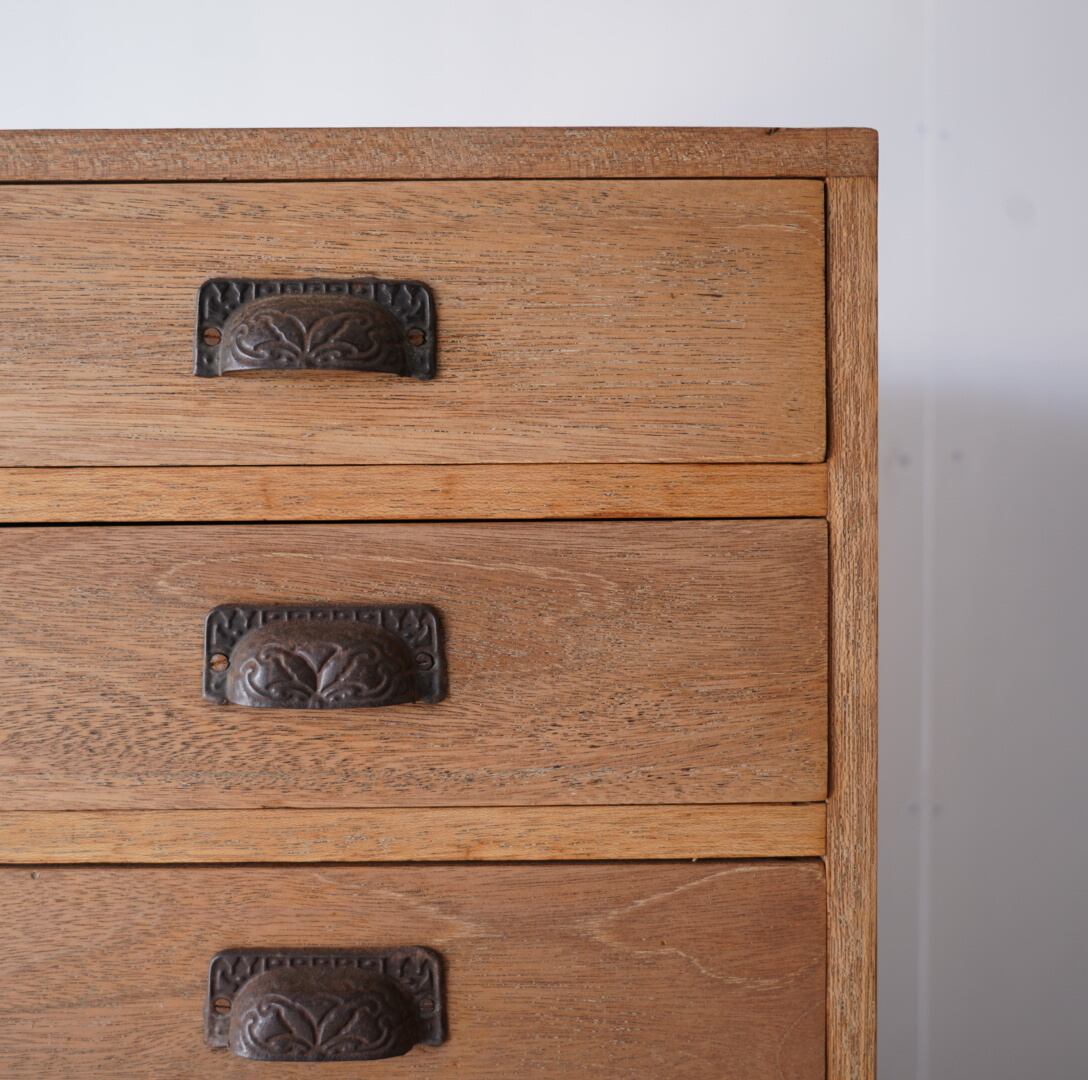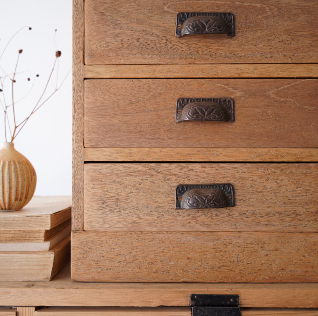 温かみのある木味と黒い金属の装飾取手が魅力的な4杯の引き出し。