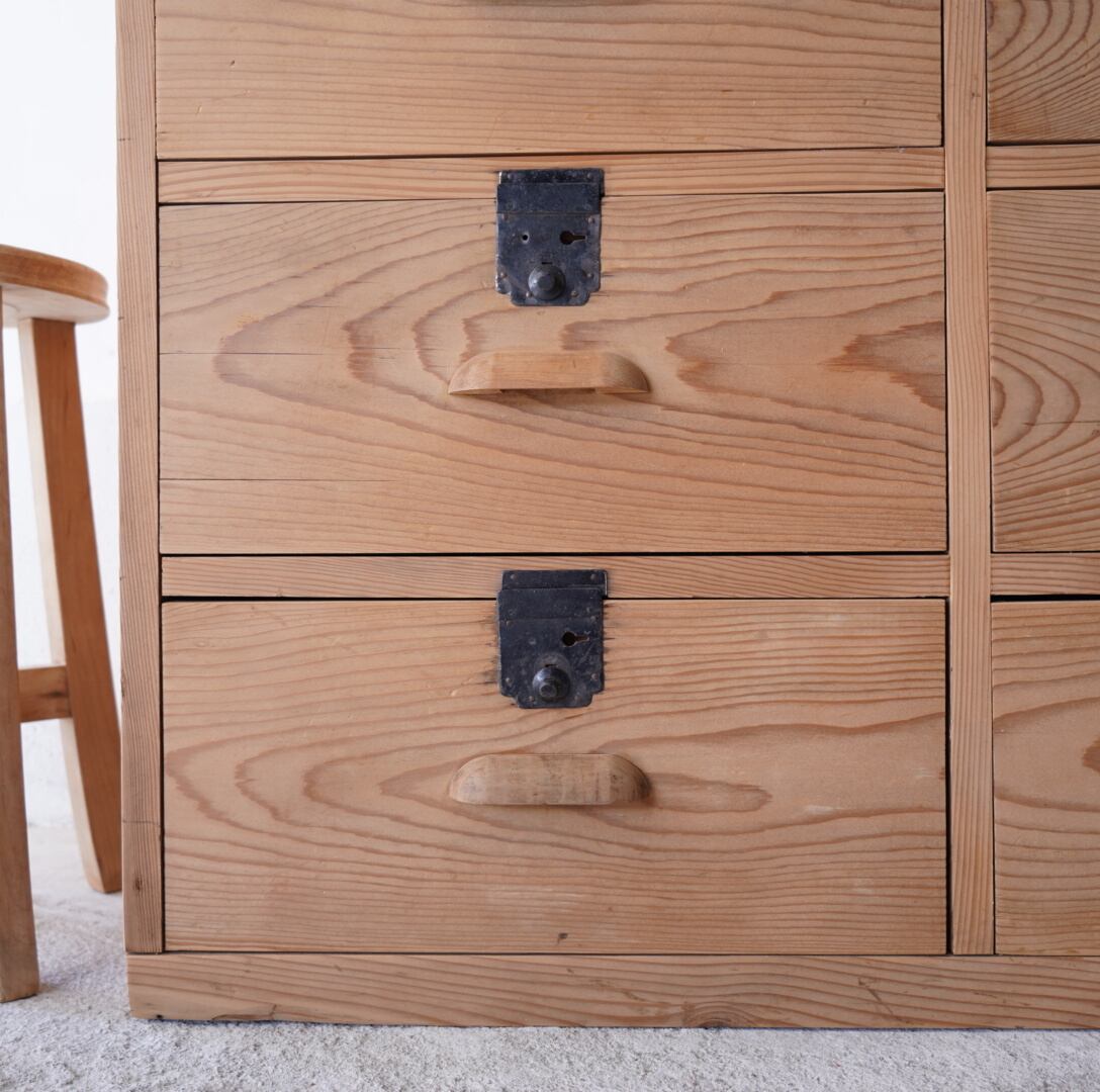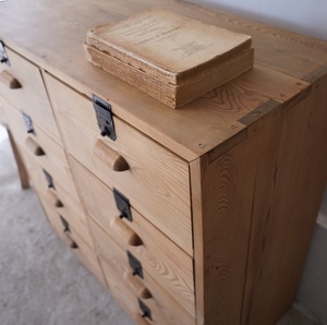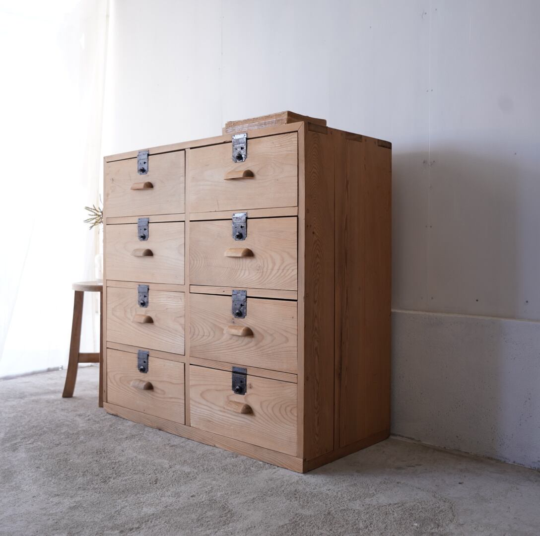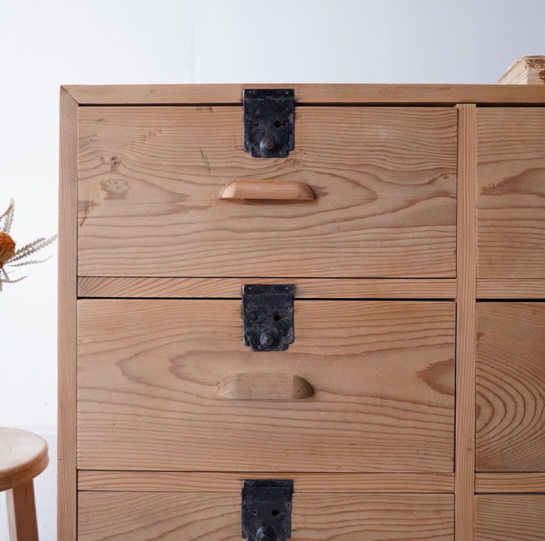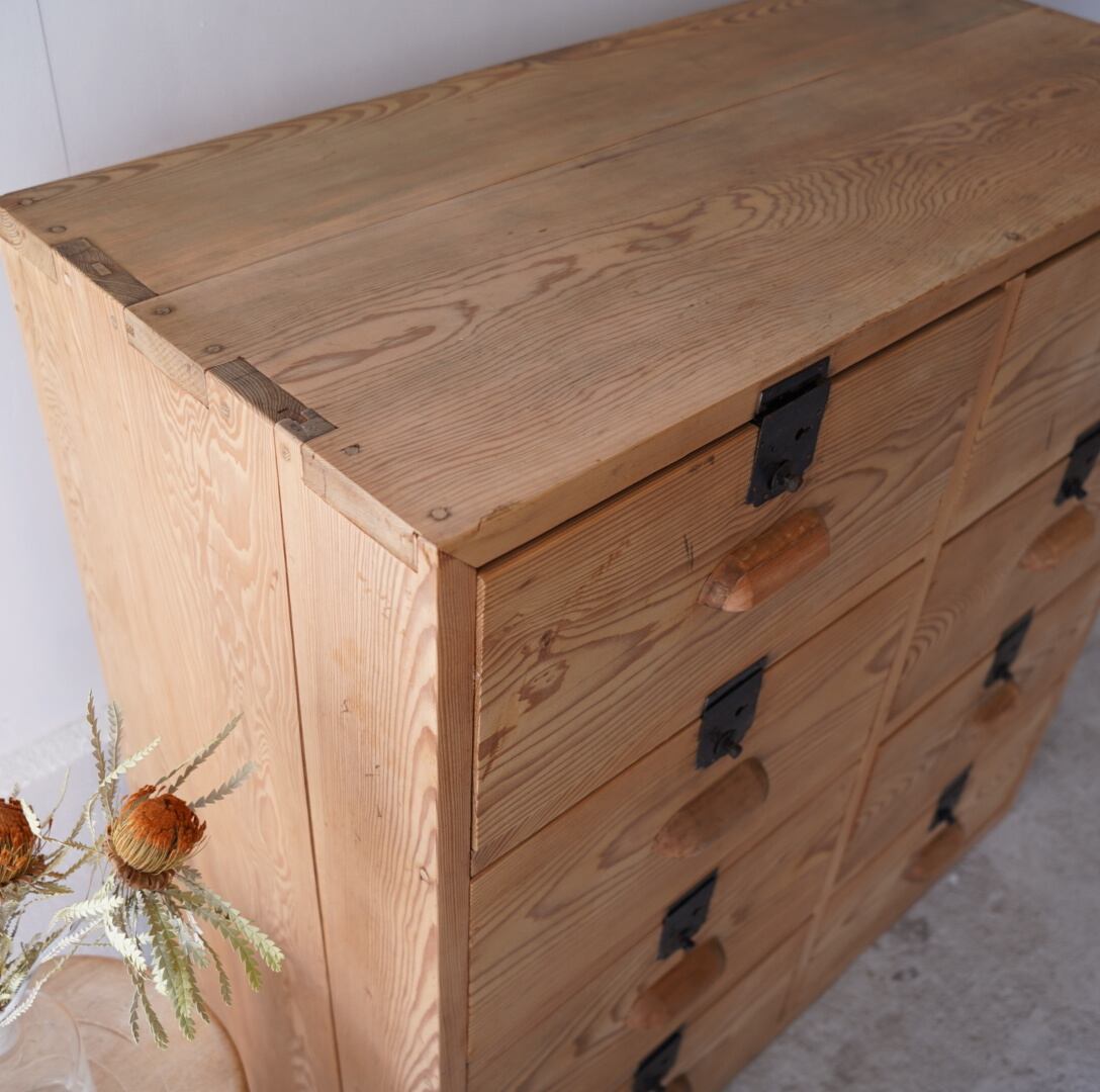 古い無垢材の素朴な風合いが魅力的な8杯の引き出しチェスト。