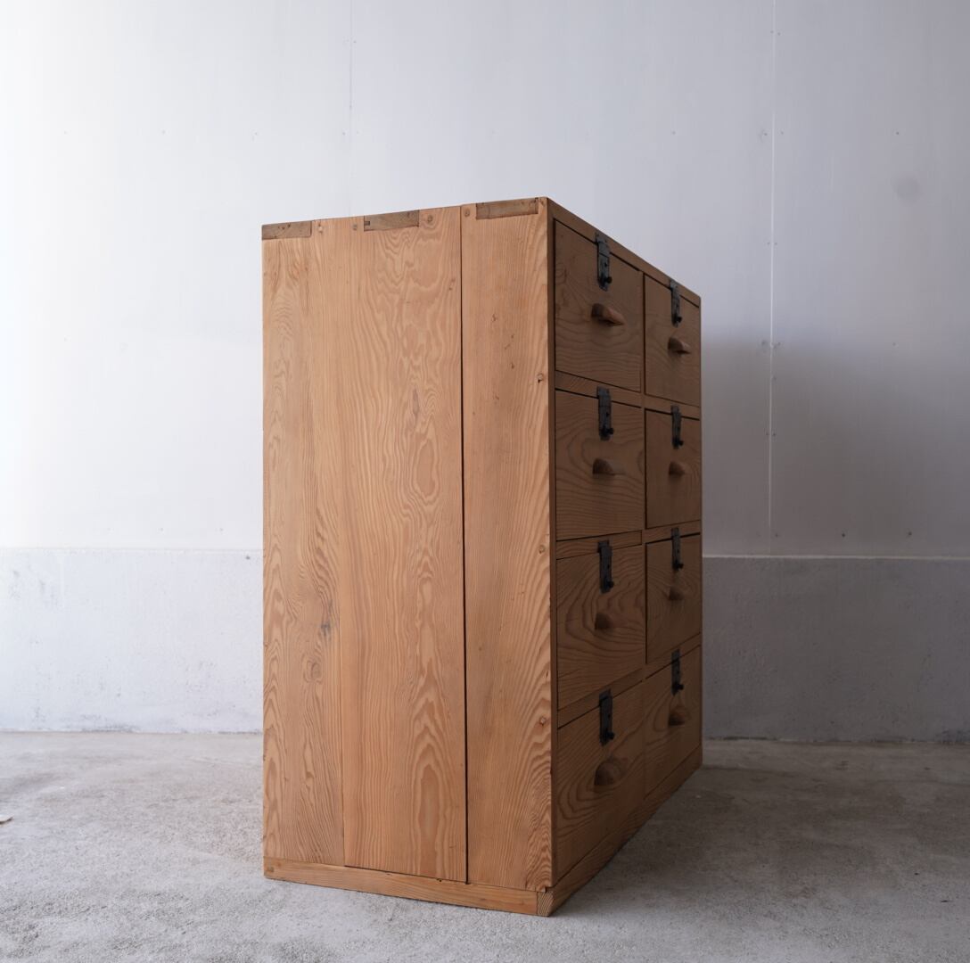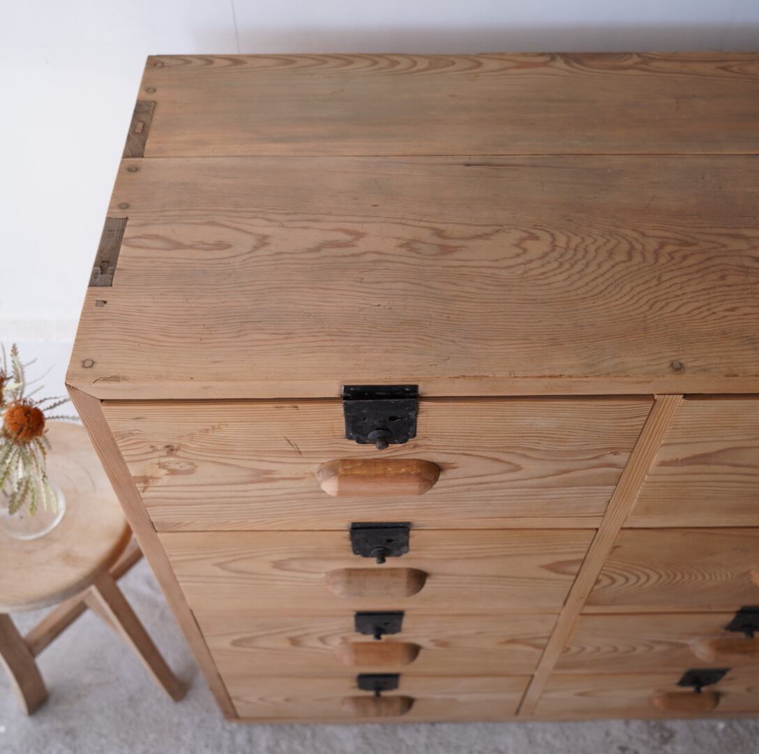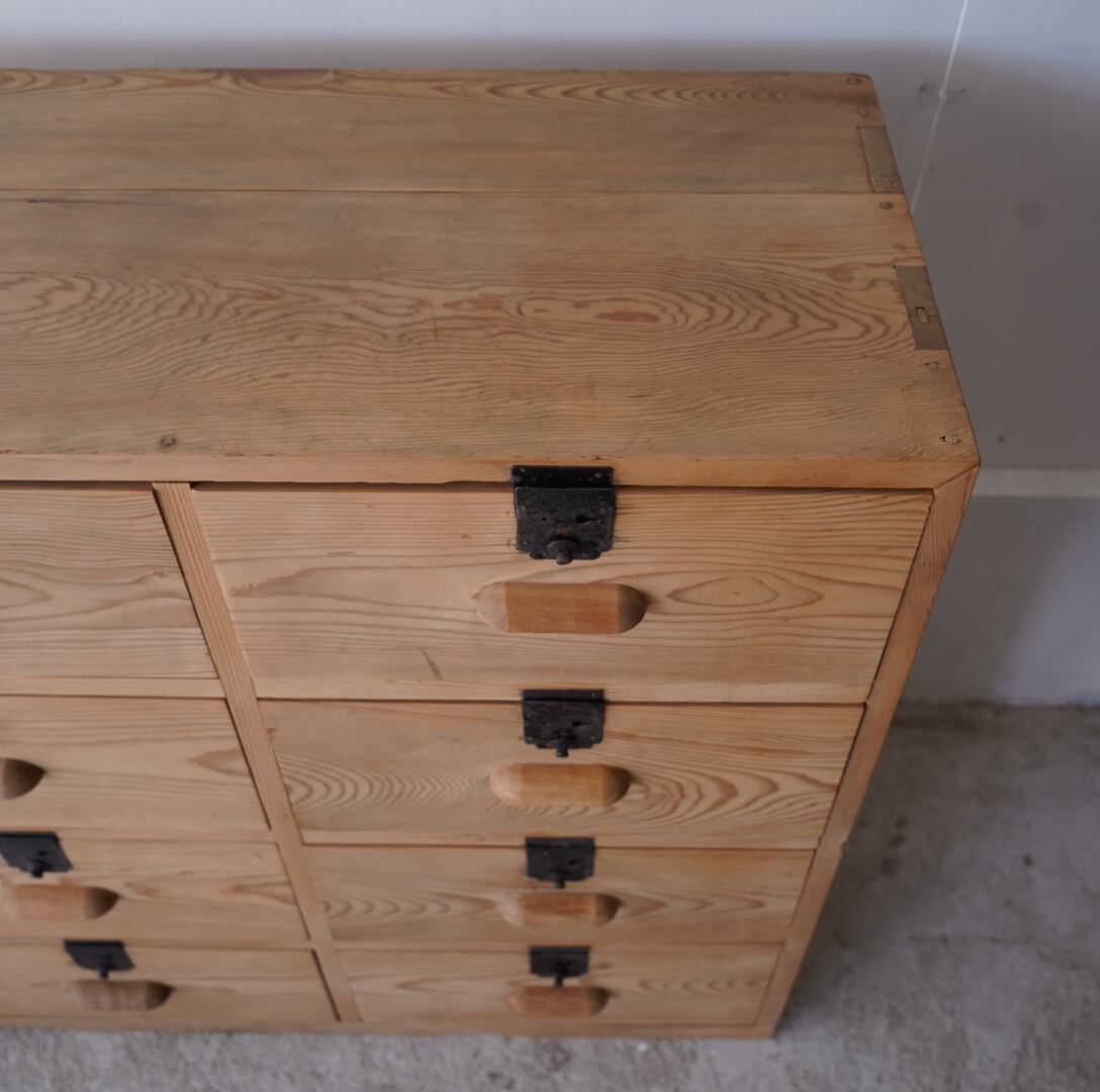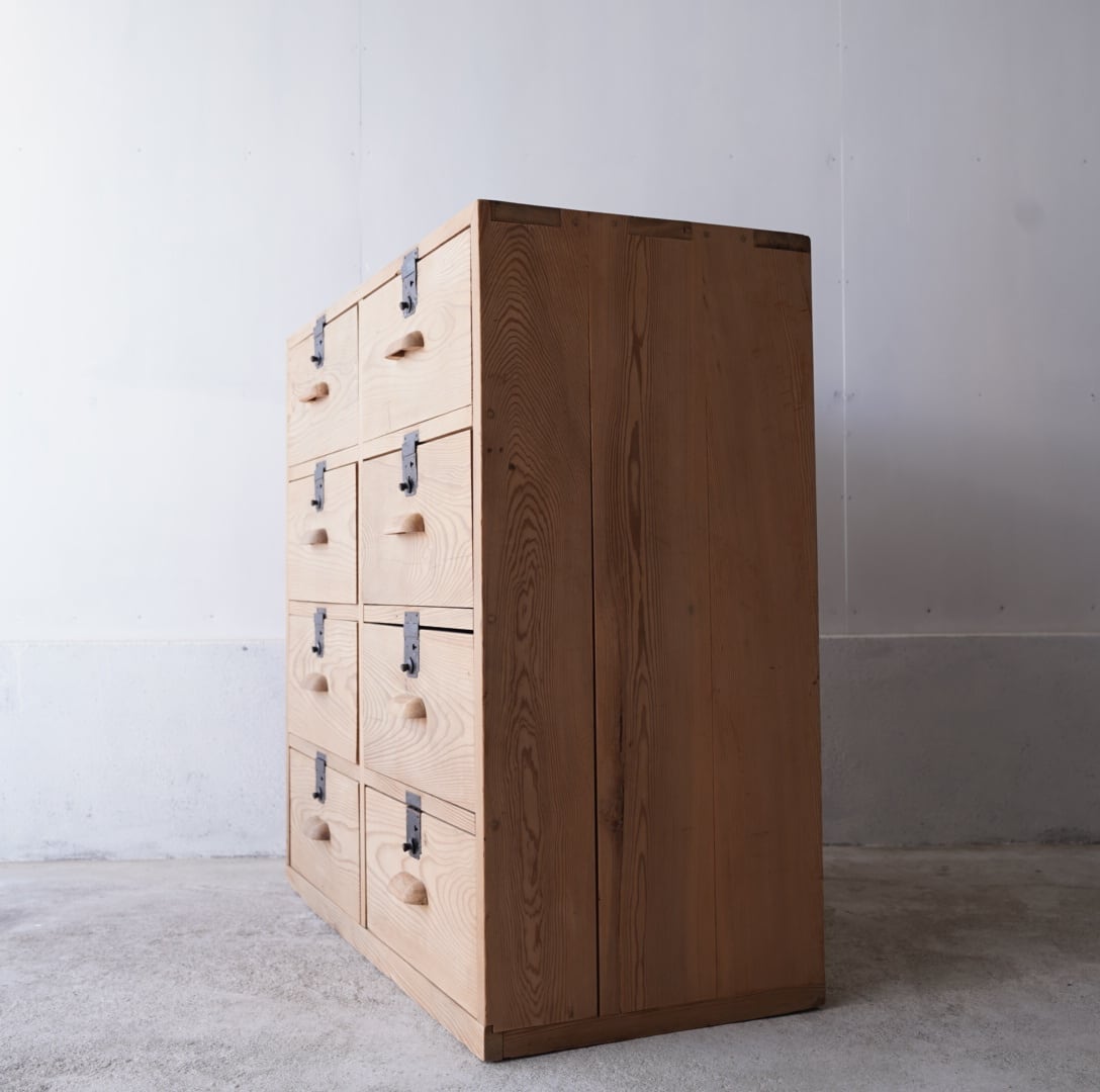 古い無垢材の素朴な風合いが魅力的な8杯の引き出しチェスト。