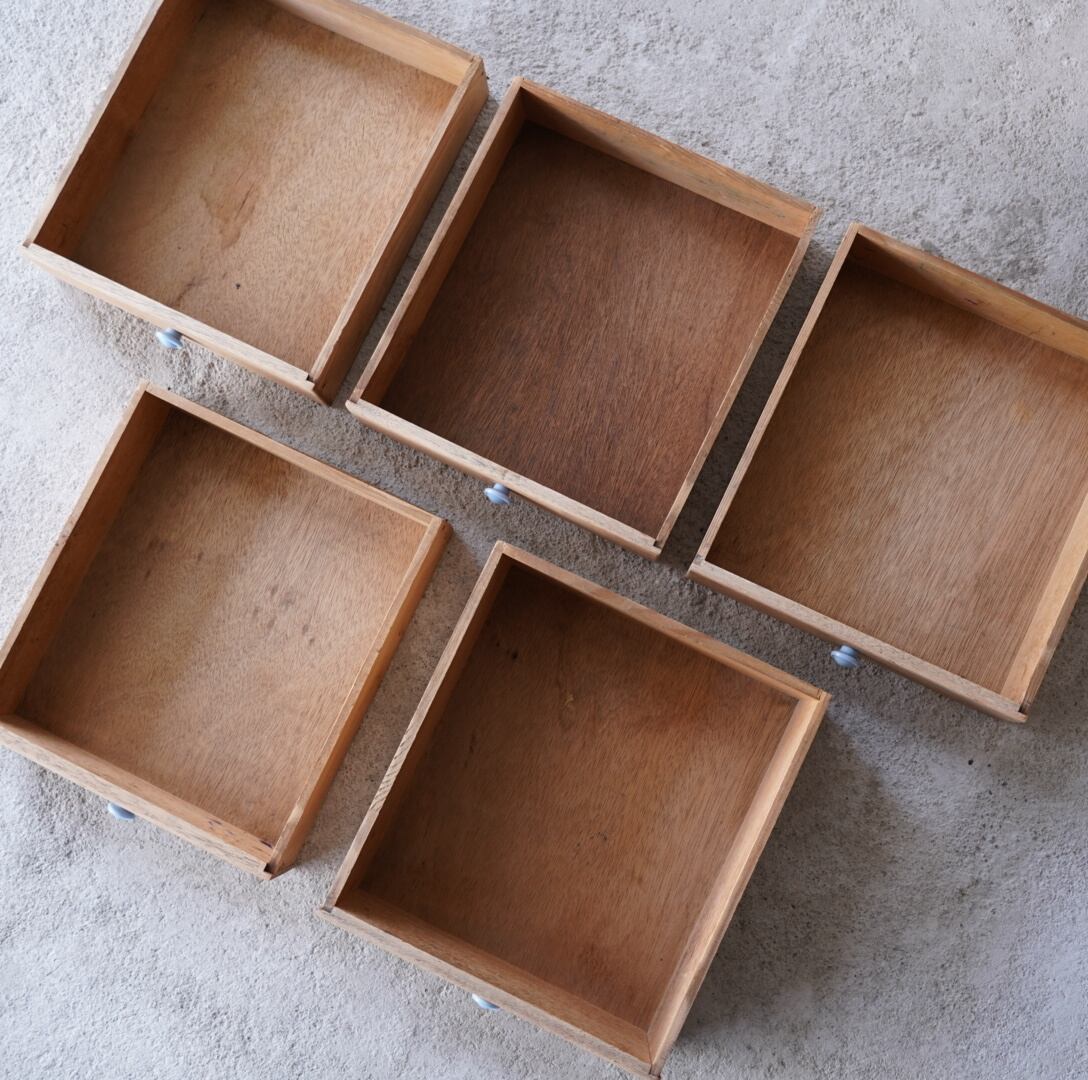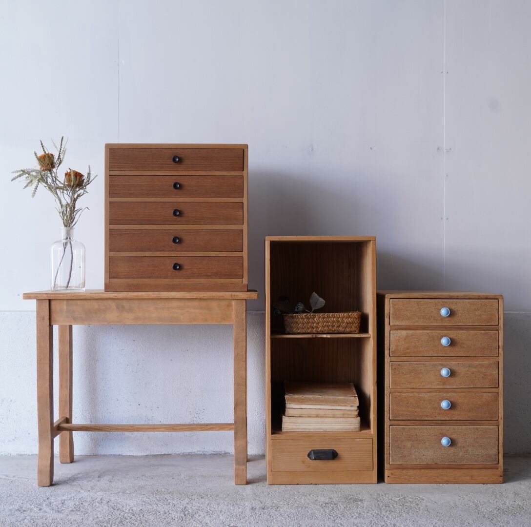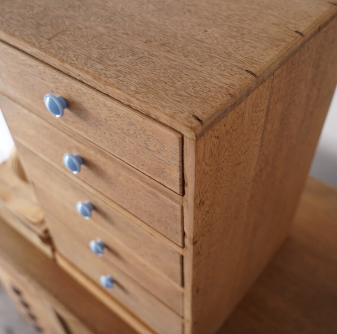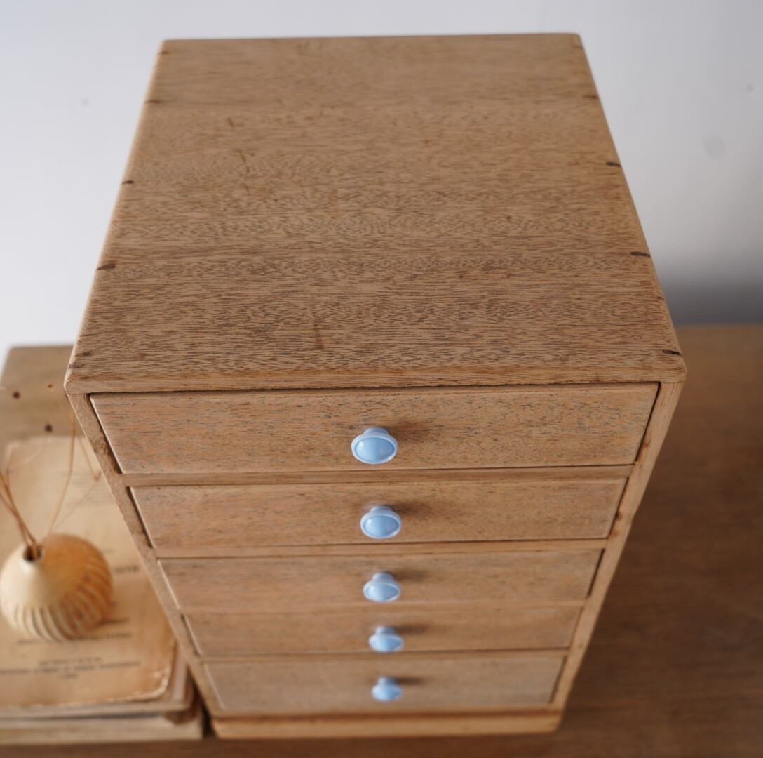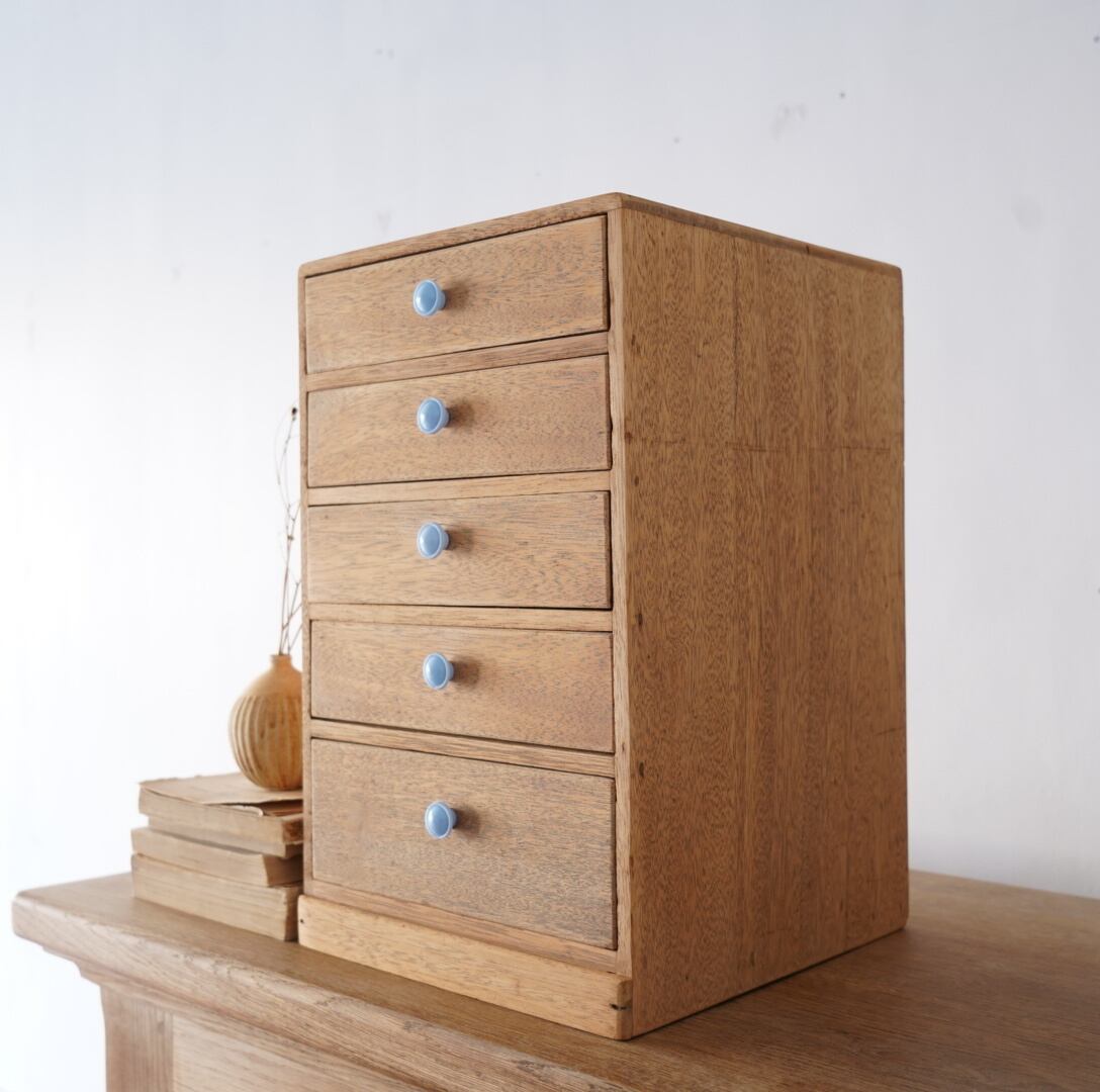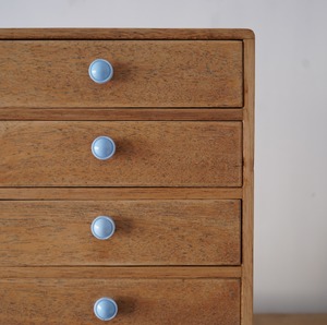 ナチュラルな木味と水色のつまみが可愛らしい5杯の引き出し。