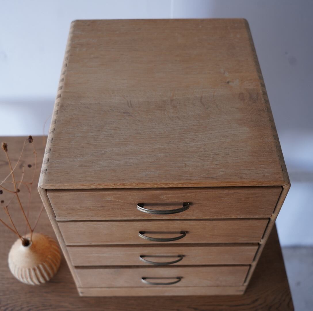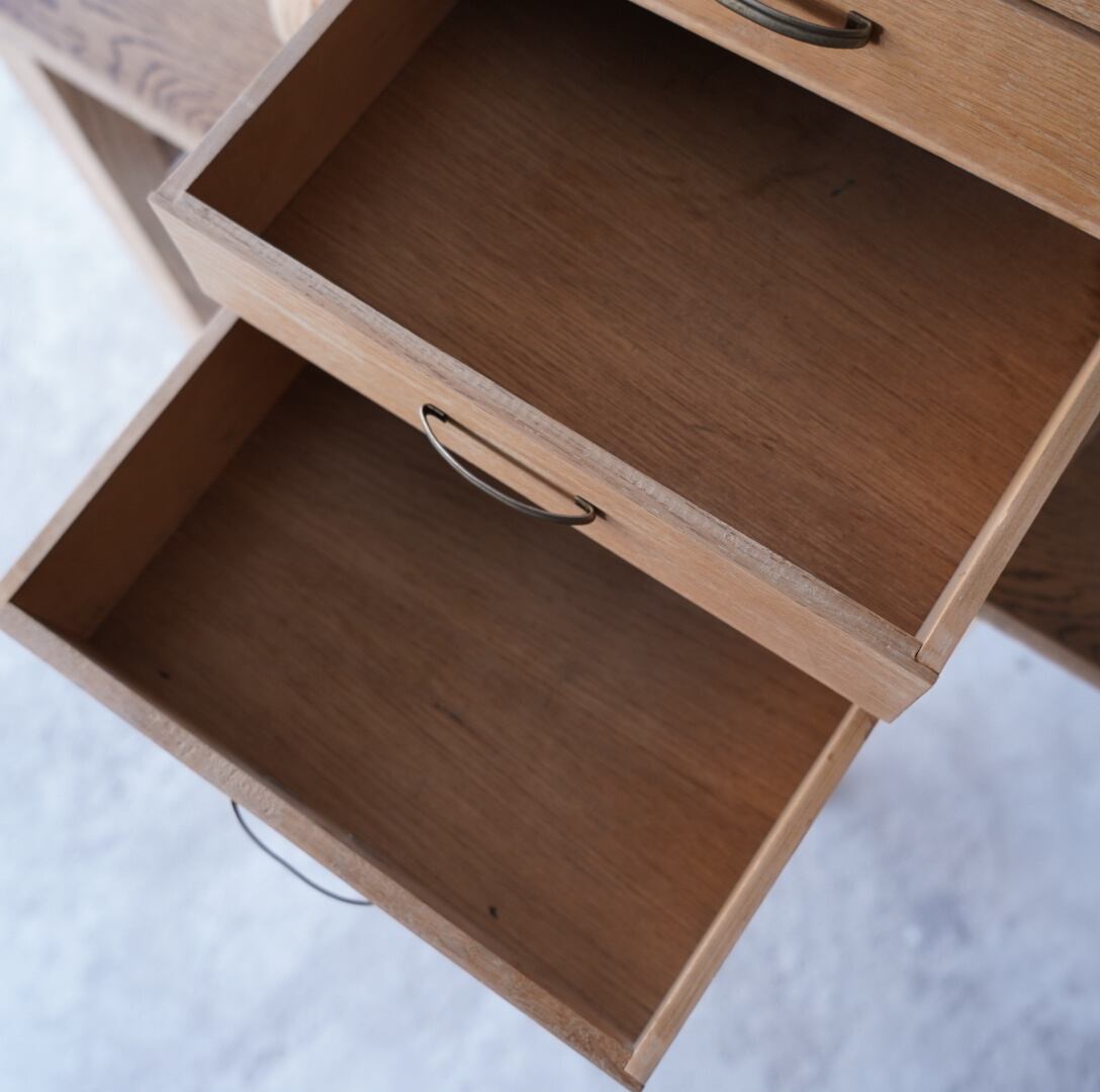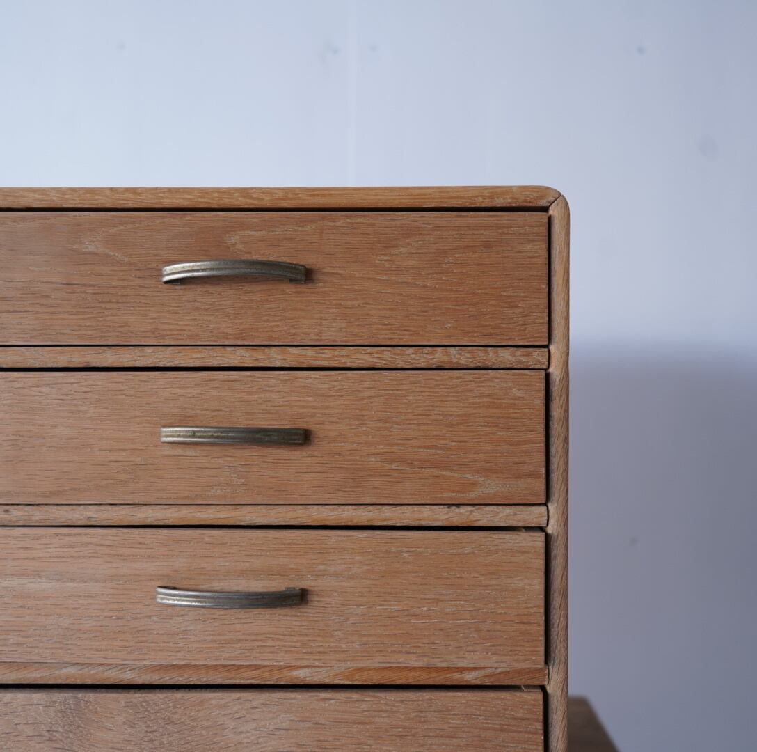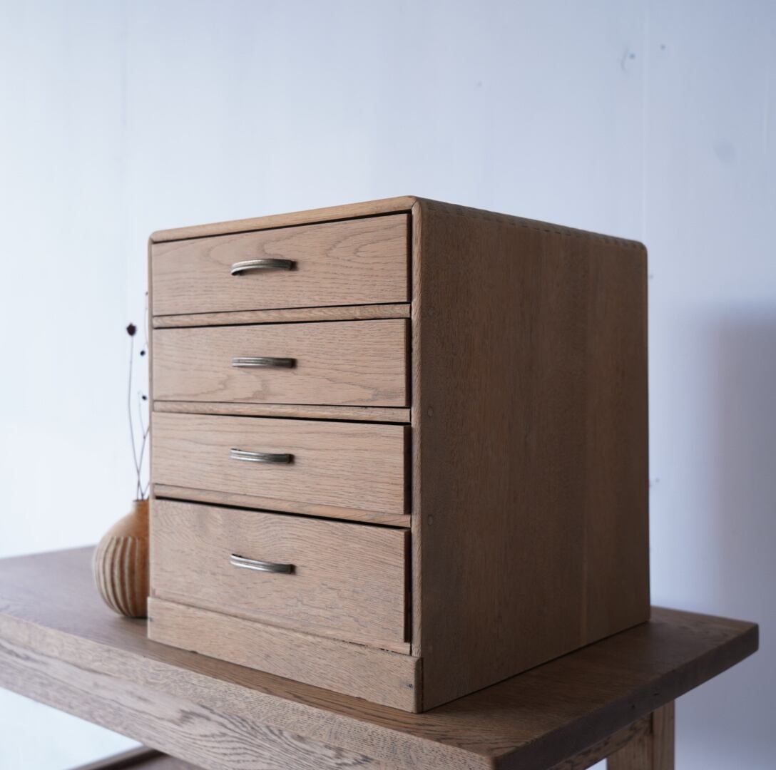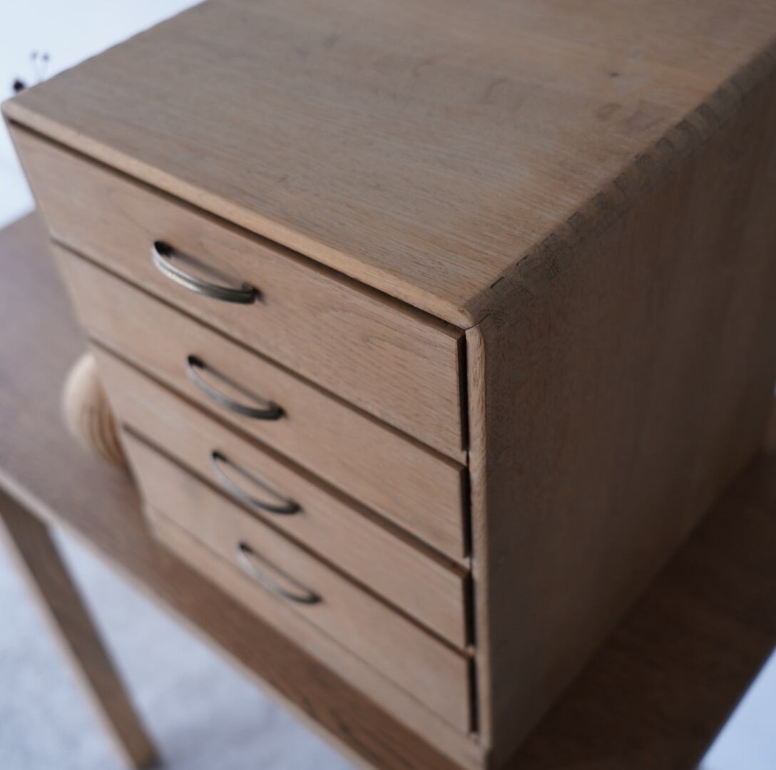 ナチュラルな木味、並んだ金属の取手が可愛らしい4杯の引き出し。