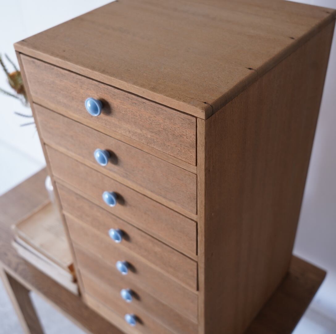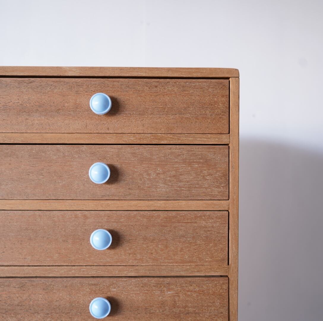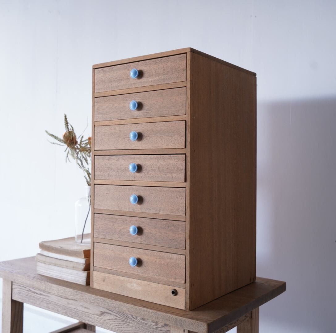 無垢材のナチュラルな木味とならんだ水色のつまみが可愛らしい7杯の引き出し。
