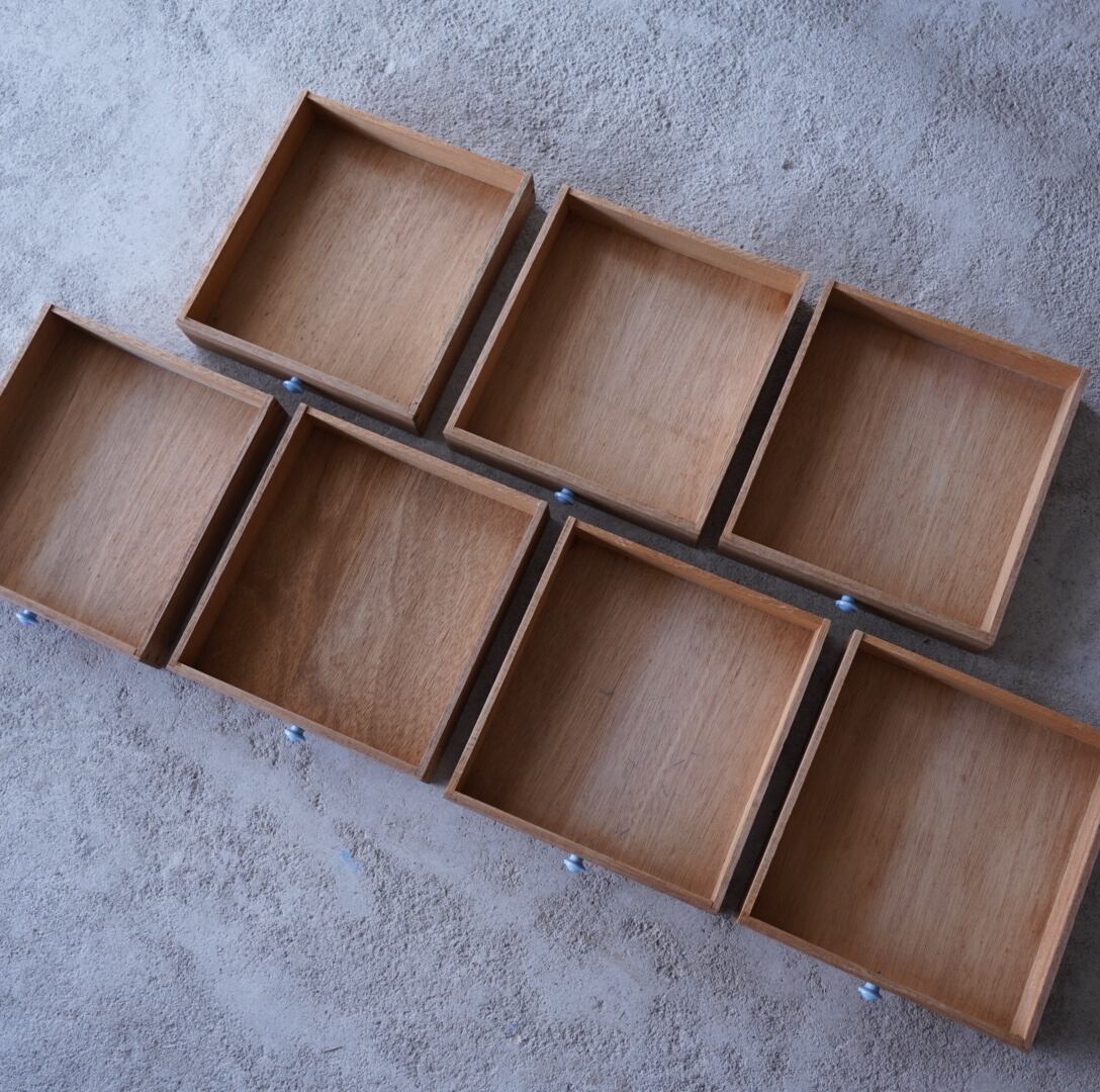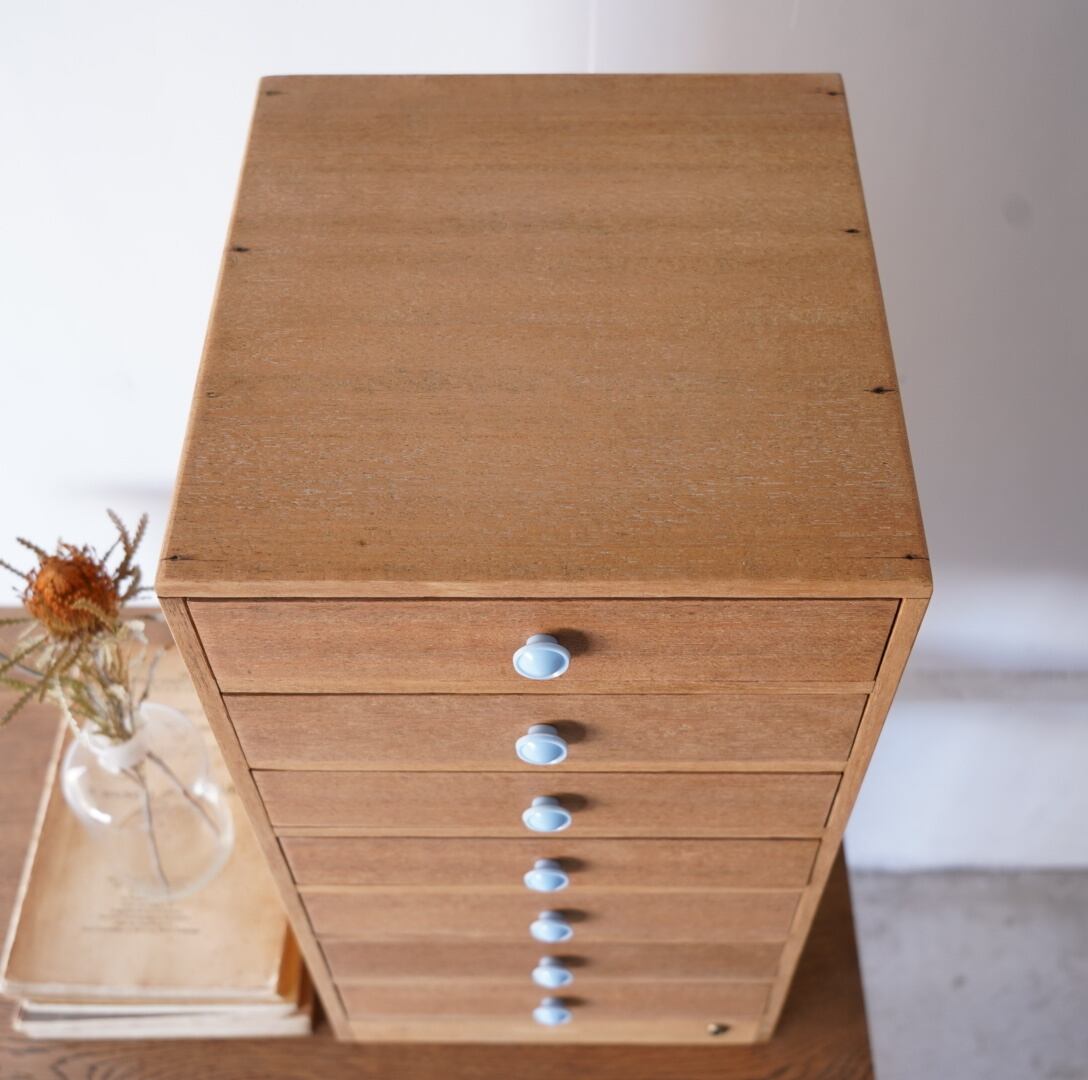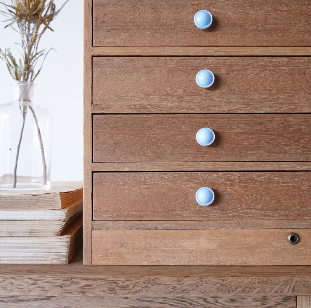 無垢材のナチュラルな木味とならんだ水色のつまみが可愛らしい7杯の引き出し。