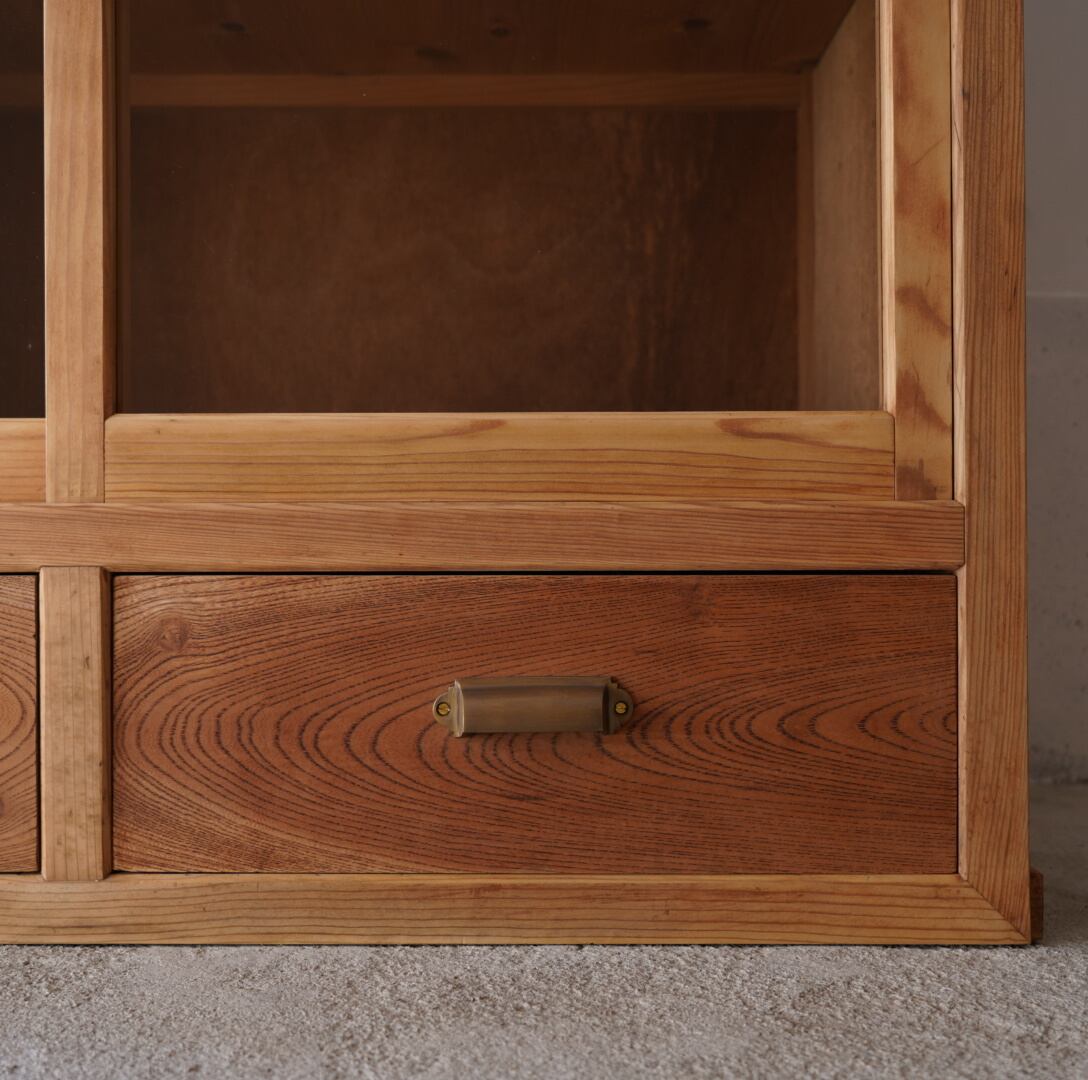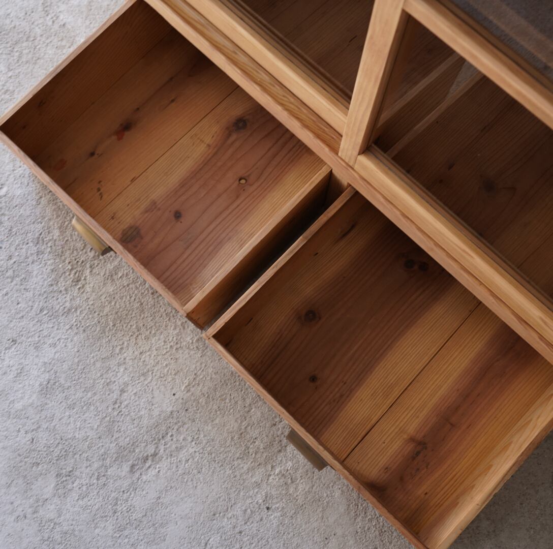 無垢材のナチュラルな木味と真鍮取手の引き出しが美しいキャビネット。